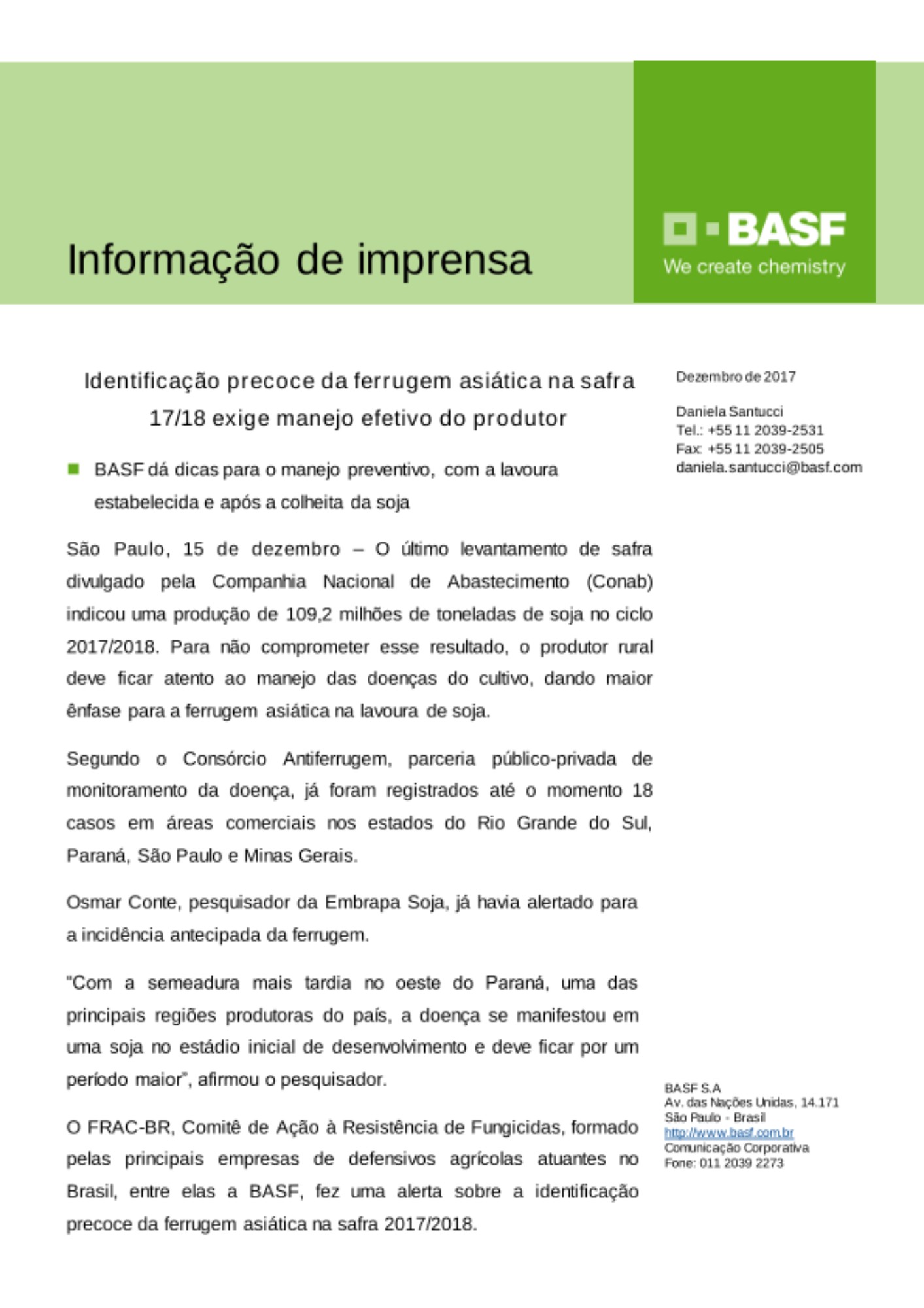 Prezado jornalista, favor contatar a BASF, por meio de sua área da Comunicação Corporativa, em caso de informações sobre os produtos e sua correta aplicação. Uso exclusivamente agrícola. Aplique somente as doses recomendadas. Descarte corretamente as embalagens e restos de produtos. Incluir outros métodos de controle do programa do Manejo Integrado de Pragas (MIP) quando disponíveis e apropriados. Os produtos Status®, Ativum®, Orkestra® SC e Versatilis® estão devidamente registrados no Ministério da Agricultura, Pecuária e Abastecimento sob os números: 6210, 11216, 08813 e 01188593.