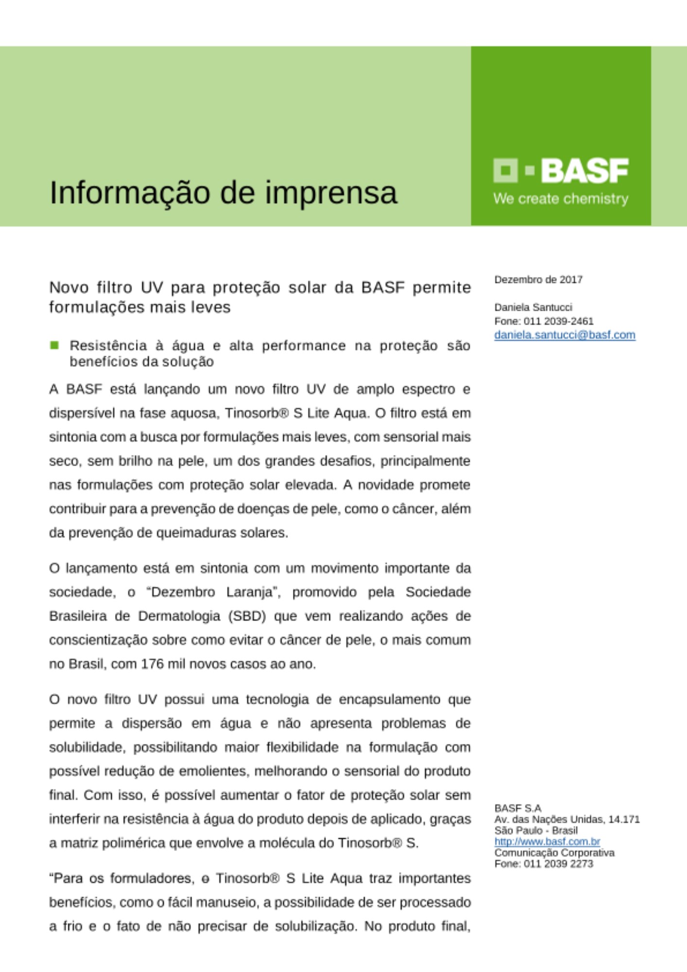 A BASF está lançando um novo filtro UV de amplo espectro e dispersível na fase aquosa, Tinosorb® S Lite Aqua. O filtro está em sintonia com a busca por formulações mais leves, com sensorial mais seco, sem brilho na pele, um dos grandes desafios, principalmente nas formulações com proteção solar elevada. A novidade promete contribuir para a prevenção de doenças de pele, como o câncer, além da prevenção de queimaduras solares.