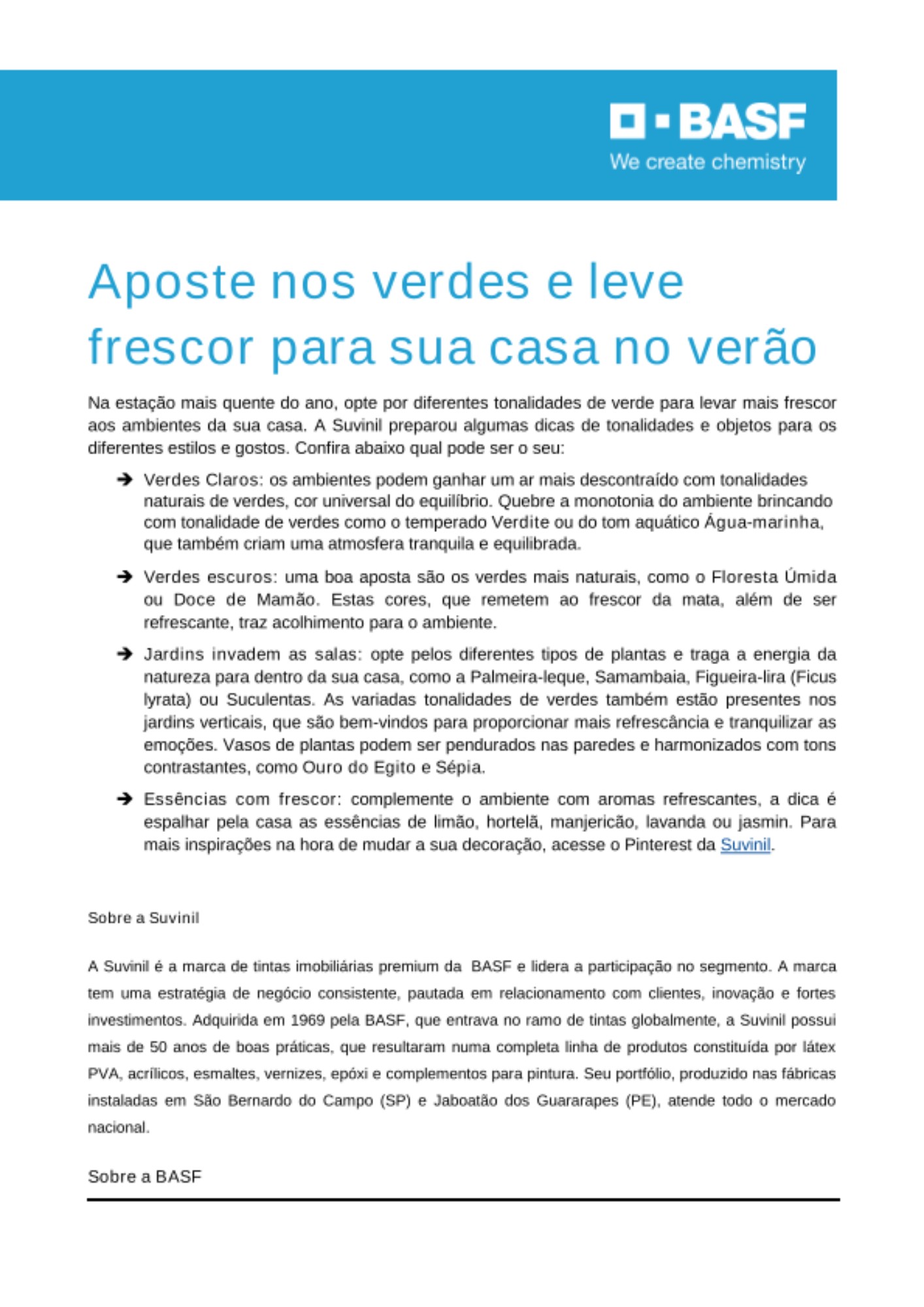 Na estação mais quente do ano, opte por diferentes tonalidades de verde para levar mais frescor aos ambientes da sua casa. A Suvinil preparou algumas dicas de tonalidades e objetos para os diferentes estilos e gostos. Confira abaixo qual pode ser o seu: