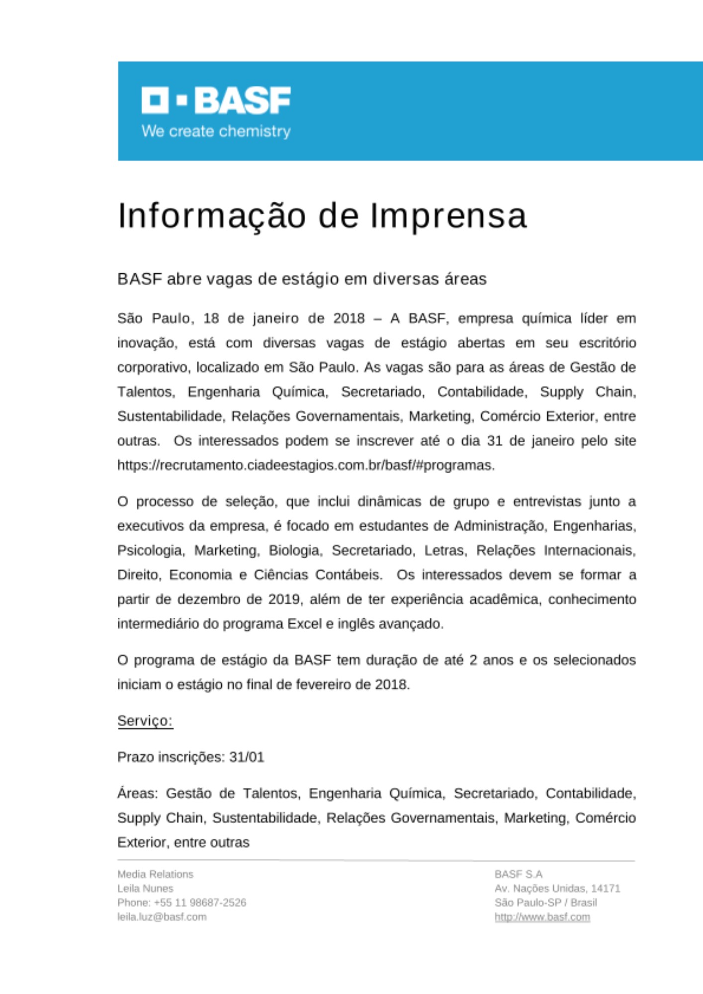 A BASF, empresa química líder em inovação, está com diversas vagas de estágio abertas em seu escritório corporativo, localizado em São Paulo. As vagas são para as áreas de Gestão de Talentos, Engenharia Química, Secretariado, Contabilidade, Supply Chain, Sustentabilidade, Relações Governamentais, Marketing, Comércio Exterior, entre outras.
