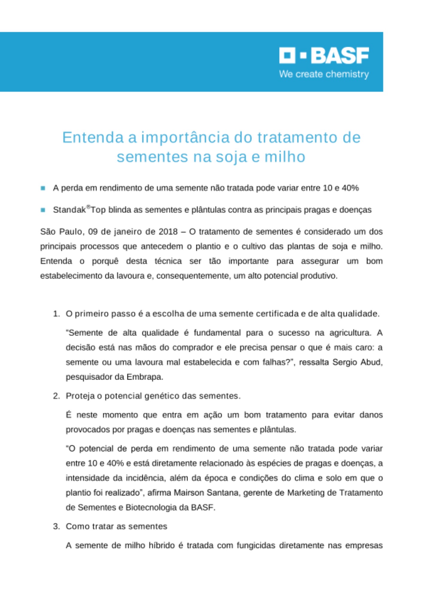 Prezado jornalista, favor contatar a BASF, por meio de sua área da Comunicação Corporativa, em caso de informações sobre os produtos e sua correta aplicação. Uso exclusivamente agrícola. Aplique somente as doses recomendadas. Descarte corretamente as embalagens e restos de produtos. Incluir outros métodos de controle do programa do Manejo Integrado de Pragas (MIP) quando disponíveis e apropriados. Standak® Top está devidamente registrado no Ministério da Agricultura, Pecuária e Abastecimento sob o número 01209.