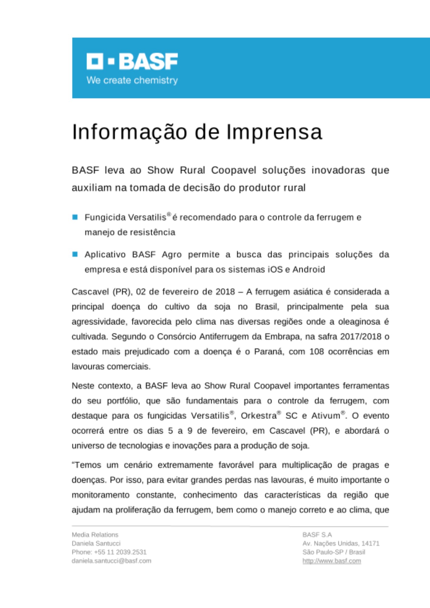 O Versatilis® será apresentado pela primeira vez no Show Rural Coopavel. A solução oferece facilidade e flexibilidade de aplicação nas diferentes fases de desenvolvimento da cultura, além de proporcionar incremento de produtividade para as lavouras. Em mais de 25 mil hectares de áreas de confirmação de pesquisa, por exemplo, a utilização do fungicida em associação com outras soluções da BASF resultou em um incremento de produtividade de 2 sacas de soja por hectare na safra 2016/2017, em relação às áreas padrão das fazendas onde foram realizados os testes.