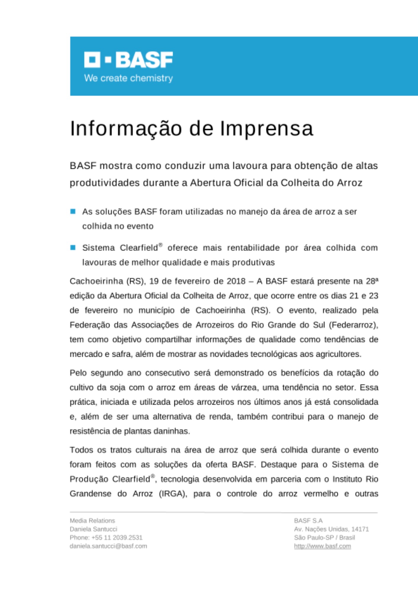 A BASF estará presente na 28ª edição da Abertura Oficial da Colheita de Arroz, que ocorre entre os dias 21 e 23 de fevereiro no município de Cachoeirinha (RS). O evento, realizado pela Federação das Associações de Arrozeiros do Rio Grande do Sul (Federarroz), tem como objetivo compartilhar informações de qualidade como tendências de mercado e safra, além de mostrar as novidades tecnológicas aos agricultores.