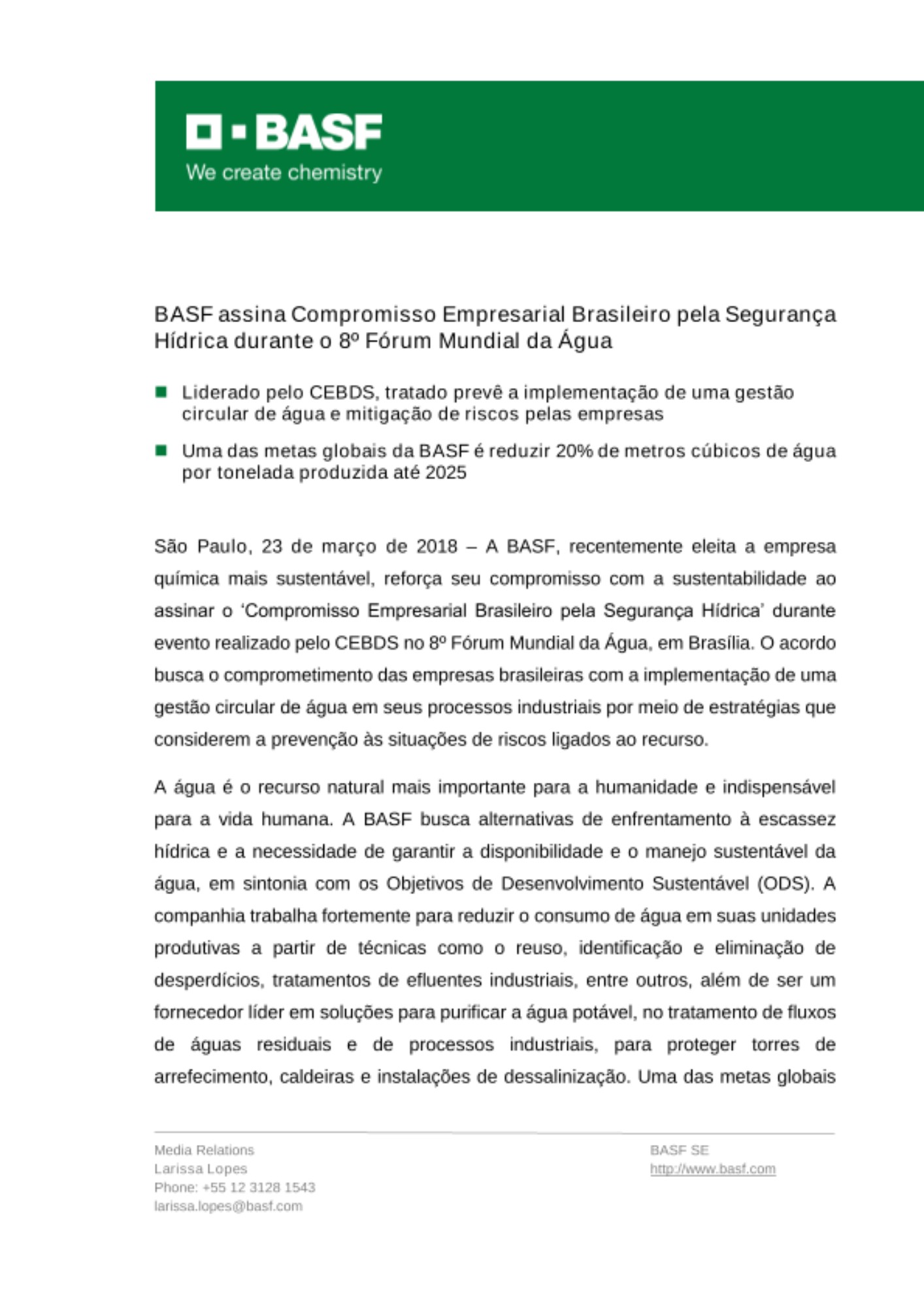 A BASF, recentemente eleita a empresa química mais sustentável, reforça seu compromisso com a sustentabilidade ao assinar o ‘Compromisso Empresarial Brasileiro pela Segurança Hídrica’ durante evento realizado pelo CEBDS no 8º Fórum Mundial da Água, em Brasília. O acordo busca o comprometimento das empresas brasileiras com a implementação de uma gestão circular de água em seus processos industriais por meio de estratégias que considerem a prevenção às situações de riscos ligados ao recurso.
