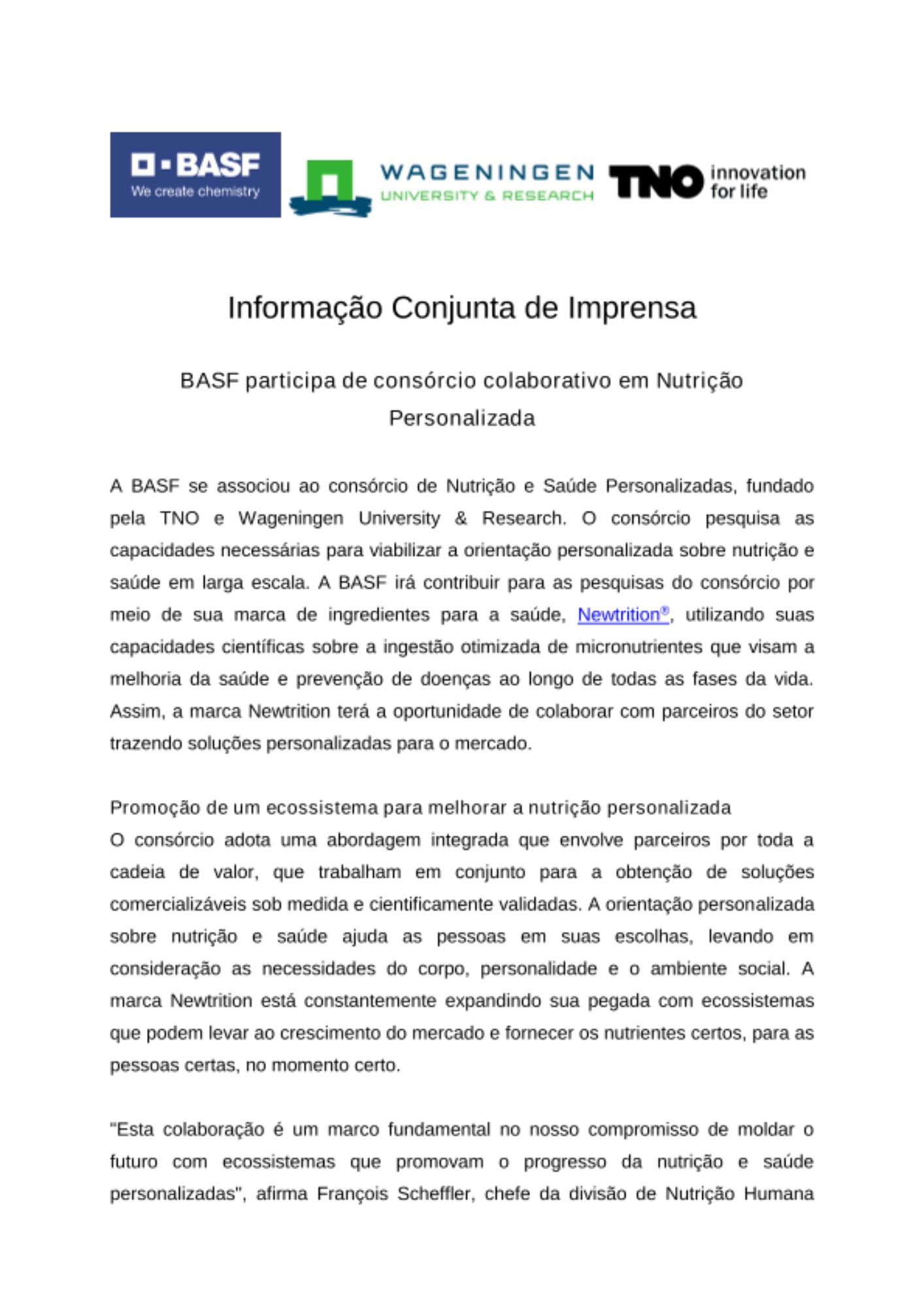 A BASF se associou ao consórcio de Nutrição e Saúde Personalizadas, fundado pela TNO e Wageningen University & Research. O consórcio pesquisa as capacidades necessárias para viabilizar a orientação personalizada sobre nutrição e saúde em larga escala. A BASF irá contribuir para as pesquisas do consórcio por meio de sua marca de ingredientes para a saúde, Newtrition®, utilizando suas capacidades científicas sobre a ingestão otimizada de micronutrientes que visam a melhoria da saúde e prevenção de doenças ao longo de todas as fases da vida. Assim, a marca Newtrition terá a oportunidade de colaborar com parceiros do setor trazendo soluções personalizadas para o mercado.