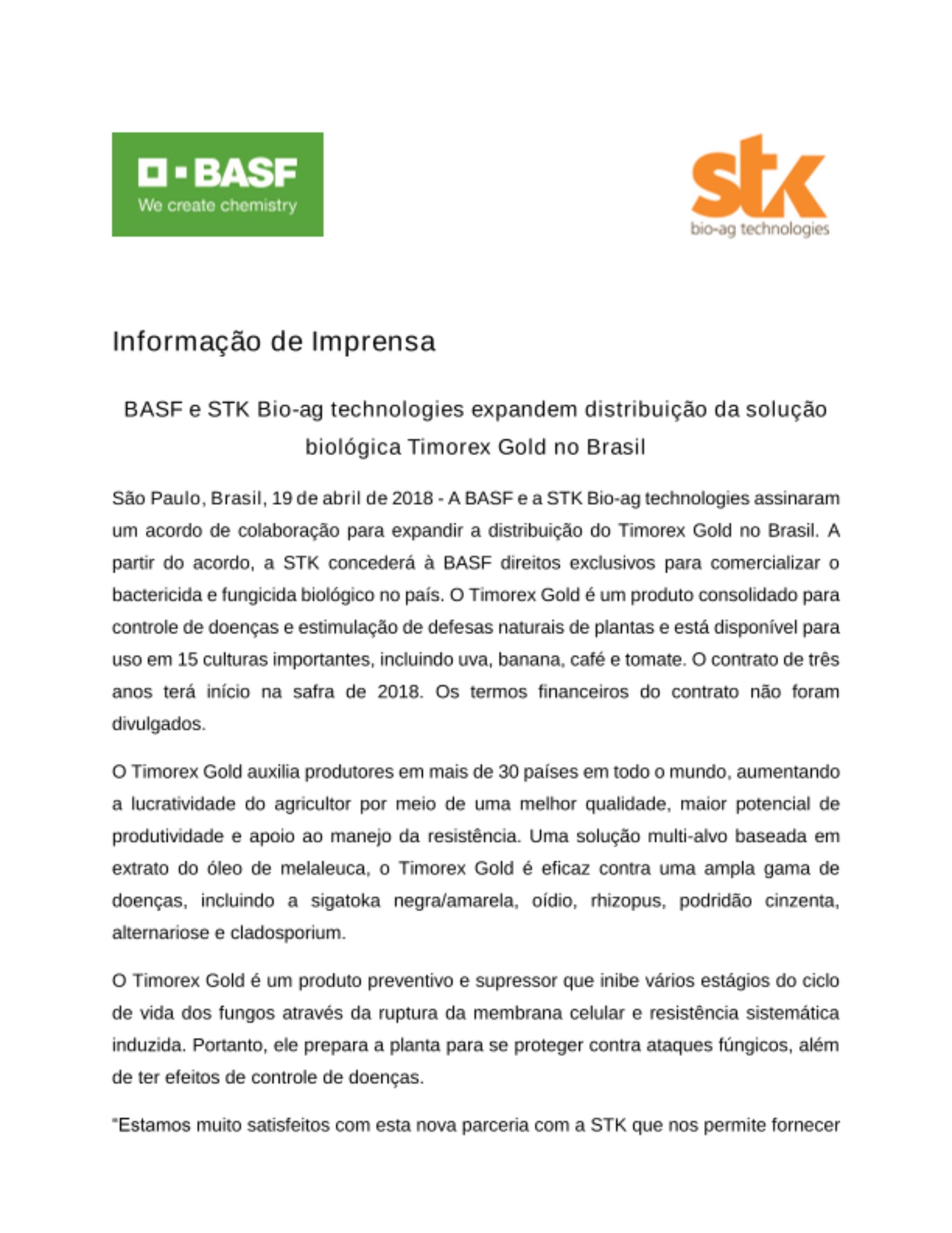 A BASF e a STK Bio-ag technologies assinaram um acordo de colaboração para expandir a distribuição do Timorex Gold no Brasil. A partir do acordo, a STK concederá à BASF direitos exclusivos para comercializar o bactericida e fungicida biológico no país. O Timorex Gold é um produto consolidado para controle de doenças e estimulação de defesas naturais de plantas e está disponível para uso em 15 culturas importantes, incluindo uva, banana, café e tomate. O contrato de três anos terá início na safra de 2018. Os termos financeiros do contrato não foram divulgados. O Timorex Gold auxilia produtores em mais de 30 países em todo o mundo, aumentando a lucratividade do agricultor por meio de uma melhor qualidade, maior potencial de produtividade e apoio ao manejo da resistência. Uma solução multi-alvo baseada em extrato do óleo de melaleuca, o Timorex Gold é eficaz contra uma ampla gama de doenças, incluindo a sigatoka negra/amarela, oídio, rhizopus, podridão cinzenta, alternariose e cladosporium.