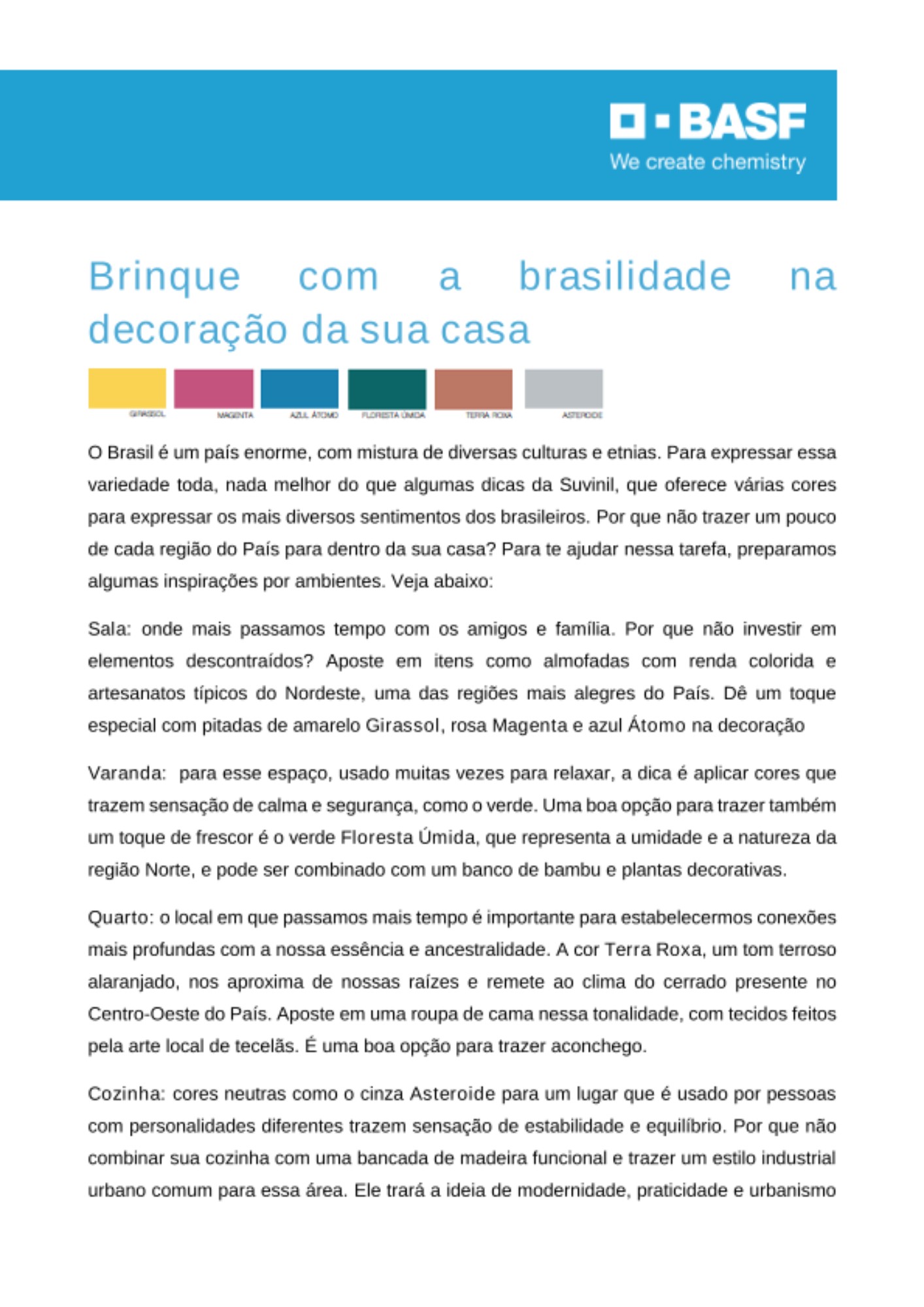 O Brasil é um país enorme, com mistura de diversas culturas e etnias. Para expressar essa variedade toda, nada melhor do que algumas dicas da Suvinil, que oferece várias cores para expressar os mais diversos sentimentos dos brasileiros. Por que não trazer um pouco de cada região do País para dentro da sua casa? Para te ajudar nessa tarefa, preparamos algumas inspirações por ambientes. Veja abaixo: