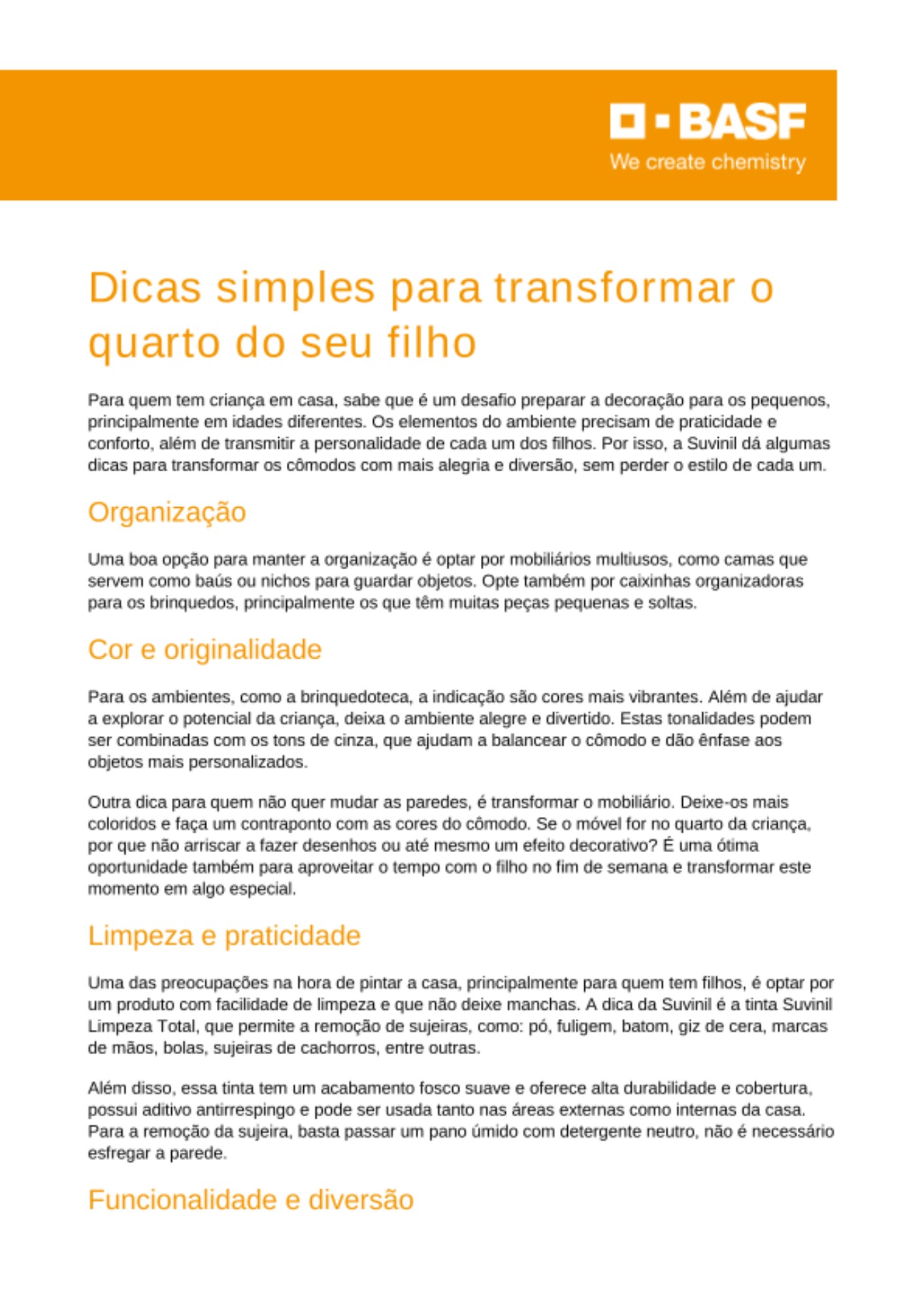 Uma das preocupações na hora de pintar a casa, principalmente para quem tem filhos, é optar por um produto com facilidade de limpeza e que não deixe manchas. A dica da Suvinil é a tinta Suvinil Limpeza Total, que permite a remoção de sujeiras, como: pó, fuligem, batom, giz de cera, marcas de mãos, bolas, sujeiras de cachorros, entre outras.
