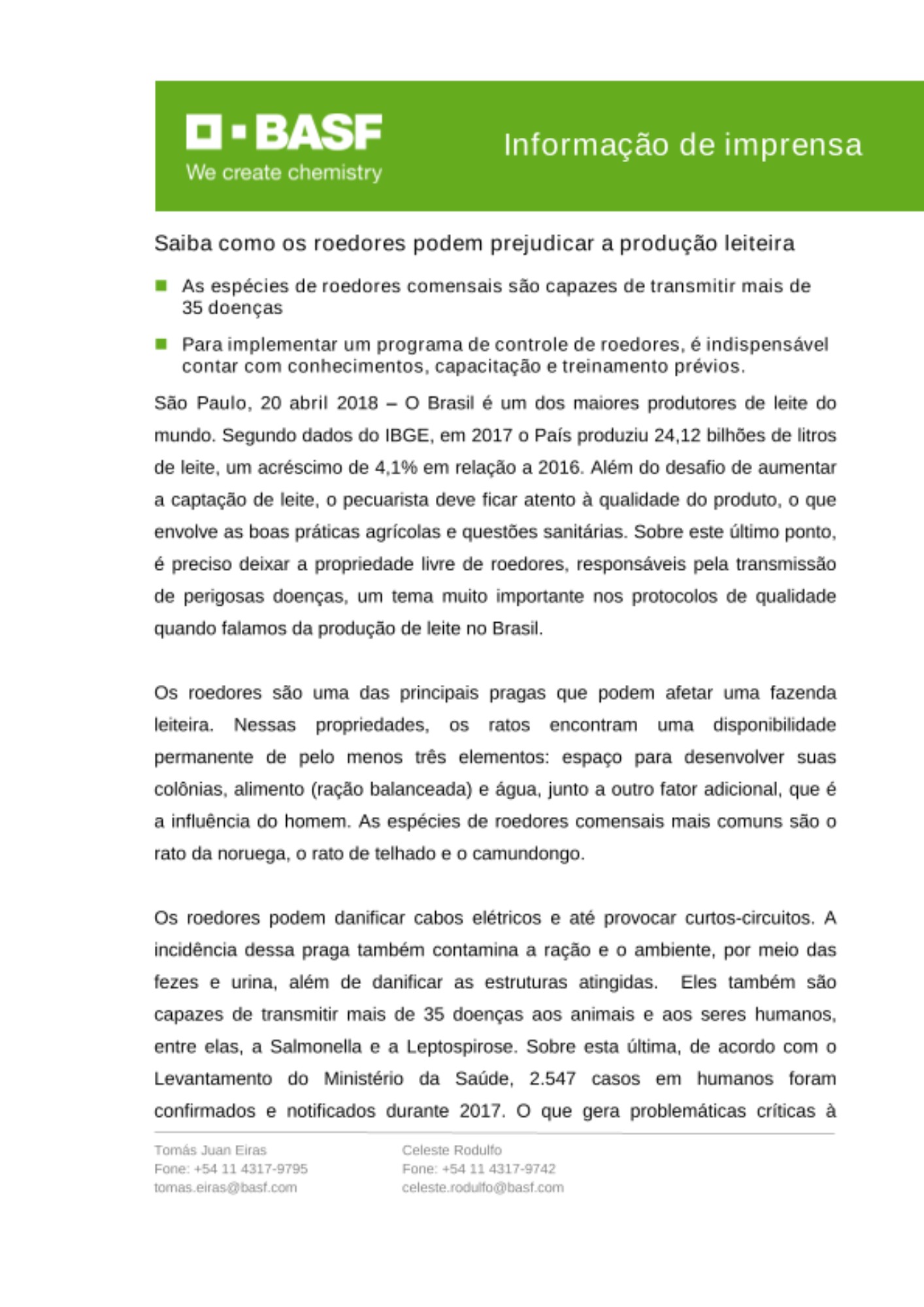 Neste contexto, a BASF conta com uma equipe de profissionais com experiência e conhecimento de campo. Por meio de investimento em pesquisa a empresa tem desenvolvido soluções diferenciadas que permitem obter excelentes resultados no controle de roedores e evitar a sua reinfestação.