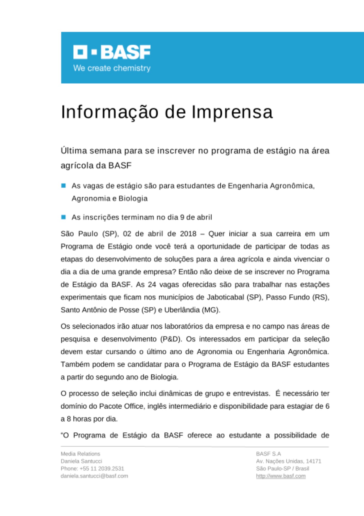 As inscrições devem ser feitas até o dia 9 de abril pelo site: www.ciadeestagios.com.br/basf. O programa tem duração de seis meses e os selecionados iniciam o estágio em junho de 2018.