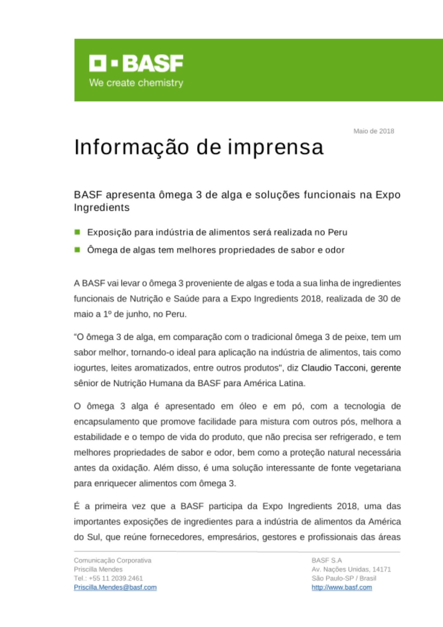 A BASF vai levar o ômega 3 proveniente de algas e toda a sua linha de ingredientes funcionais de Nutrição e Saúde para a Expo Ingredients 2018, realizada de 30 de maio a 1º de junho, no Peru. “O ômega 3 de alga, em comparação com o tradicional ômega 3 de peixe, tem um sabor melhor, tornando-o ideal para aplicação na indústria de alimentos, tais como iogurtes, leites aromatizados, entre outros produtos", diz Claudio Tacconi, gerente sênior de Nutrição Humana da BASF para América Latina.