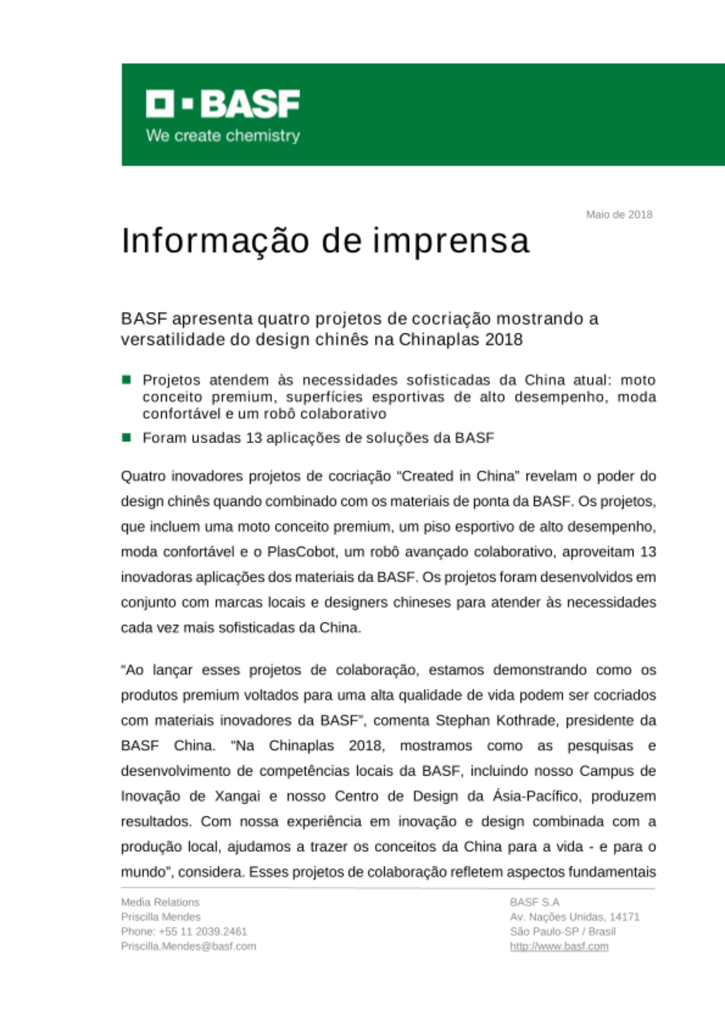 Para outras informações sobre a BASF na Chinaplas 2018, acesse www.basf.com/chinaplas .