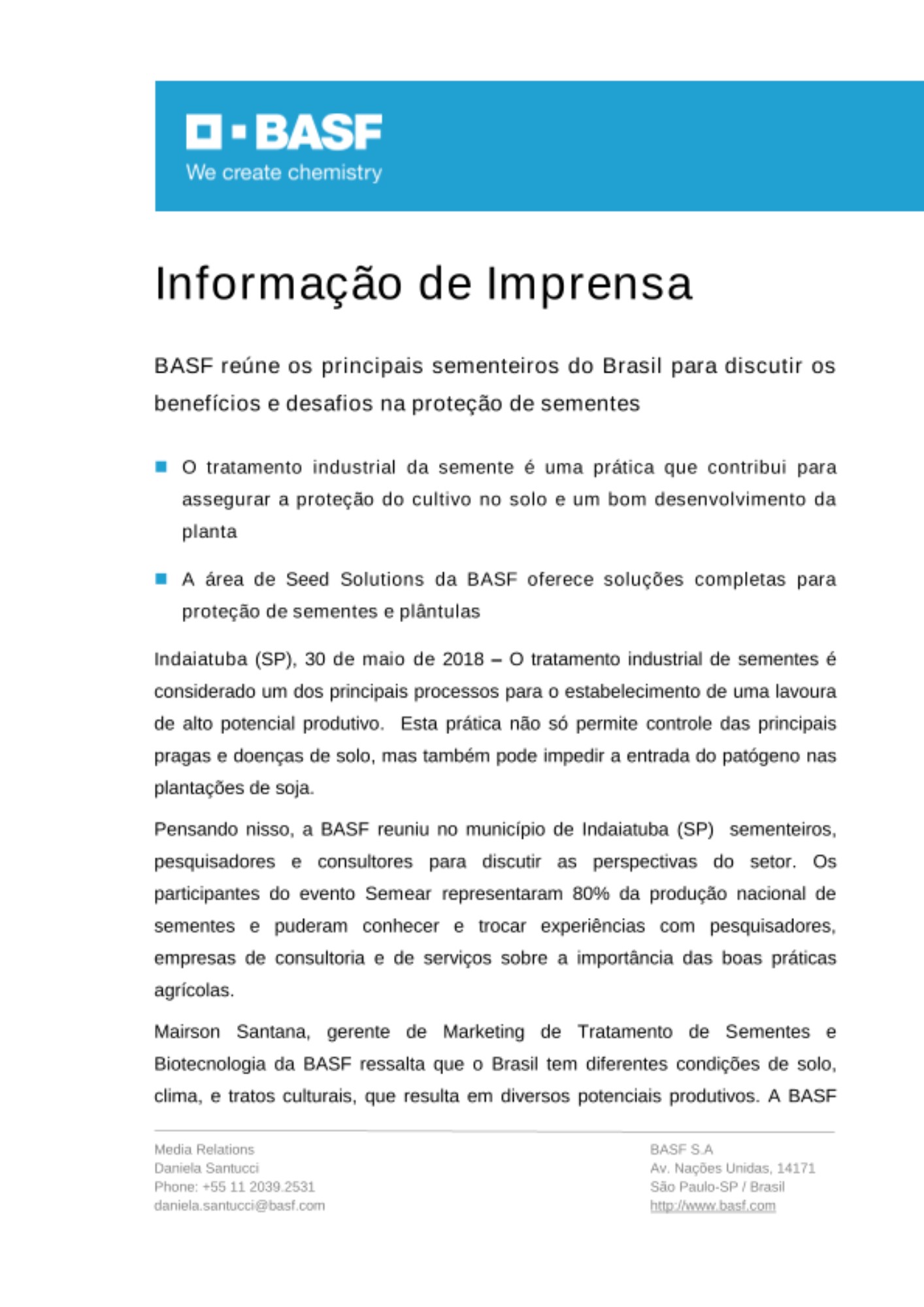 Com uma população em rápido crescimento, o mundo está cada vez mais dependente da nossa capacidade de desenvolver e manter uma agricultura sustentável e ambientes saudáveis. A divisão de Proteção de Cultivos da BASF trabalha com agricultores, profissionais agrícolas e especialistas em manejo de pragas para ajudar a tornar isso possível. Com a cooperação desses parceiros, a BASF é capaz de sustentar um robusto pipeline de P&D, um portfólio inovador de produtos e serviços e equipes de peritos no laboratório e em campo para apoiar nossos clientes no sucesso dos seus negócios. Em 2017, a divisão de Proteção de Cultivos da BASF gerou vendas de mais de € 5,7 bilhões. Para obter mais informações, visite-nos em www.agro.basf.com ou por meio de nossos canais de mídias sociais. Sobre a BASF Na BASF, nós transformamos a química para um futuro sustentável. Nós combinamos o sucesso econômico com a proteção ambiental e responsabilidade social. O Grupo BASF conta com aproximadamente 115 mil colaboradores que trabalham para contribuir com o sucesso de nossos clientes em quase todos os setores e países do mundo. Nosso portfólio é organizado em 5 segmentos: Químicos, Produtos de Performance, Materiais e Soluções Funcionais, Soluções para Agricultura e Óleo e Gás. A BASF registrou vendas de €64,5 bilhões em 2017. As ações da BASF são comercializadas no mercado de ações de Frankfurt (BAS), Londres (BFA) e Zurich (AN). Para mais informações, acesse: www.basf.com.br.