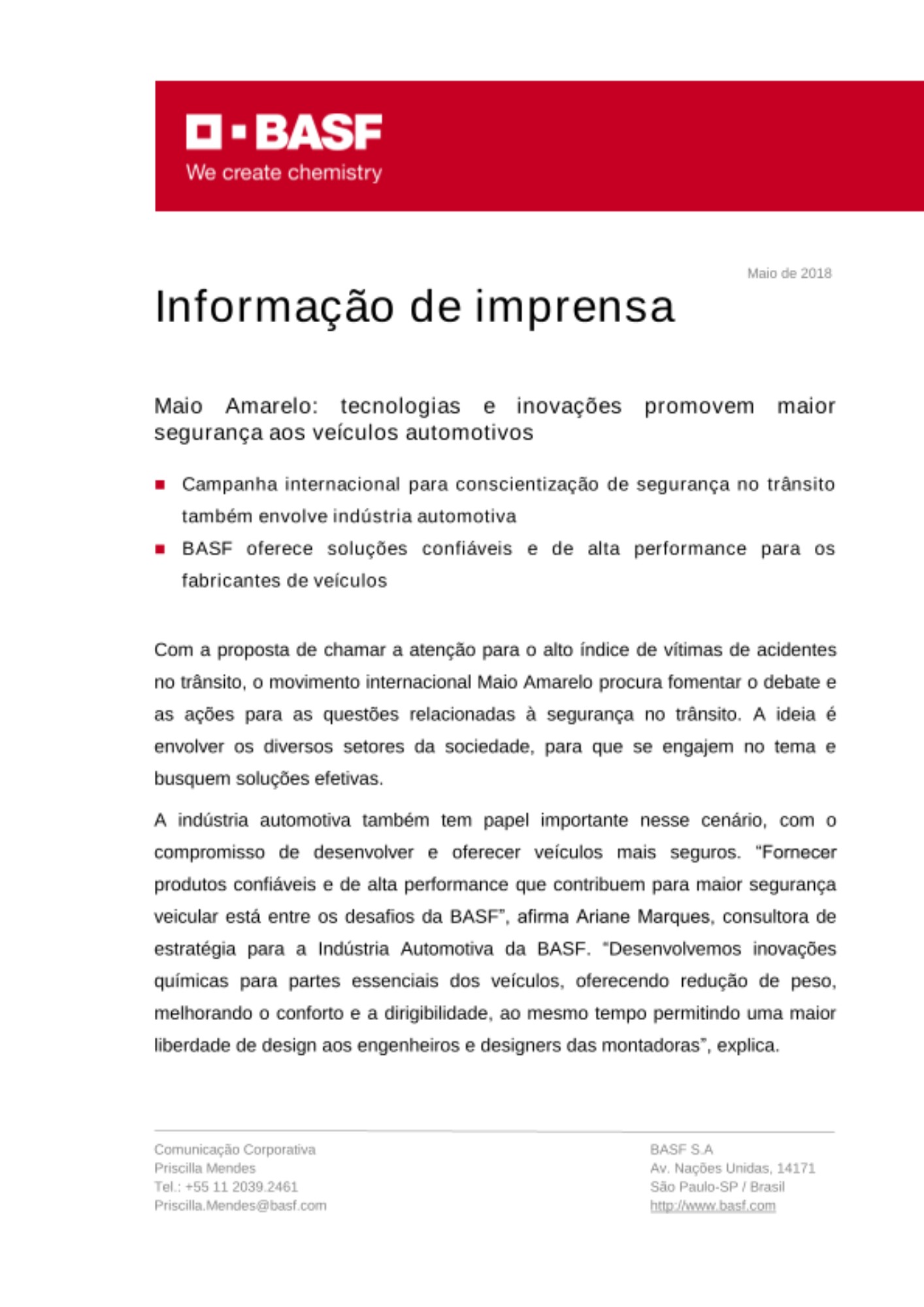 A indústria automotiva também tem papel importante nesse cenário, com o compromisso de desenvolver e oferecer veículos mais seguros. “Fornecer produtos confiáveis e de alta performance que contribuem para maior segurança veicular está entre os desafios da BASF”, afirma Ariane Marques, consultora de estratégia para a Indústria Automotiva da BASF. “Desenvolvemos inovações químicas para partes essenciais dos veículos, oferecendo redução de peso, melhorando o conforto e a dirigibilidade, ao mesmo tempo permitindo uma maior liberdade de design aos engenheiros e designers das montadoras”, explica.