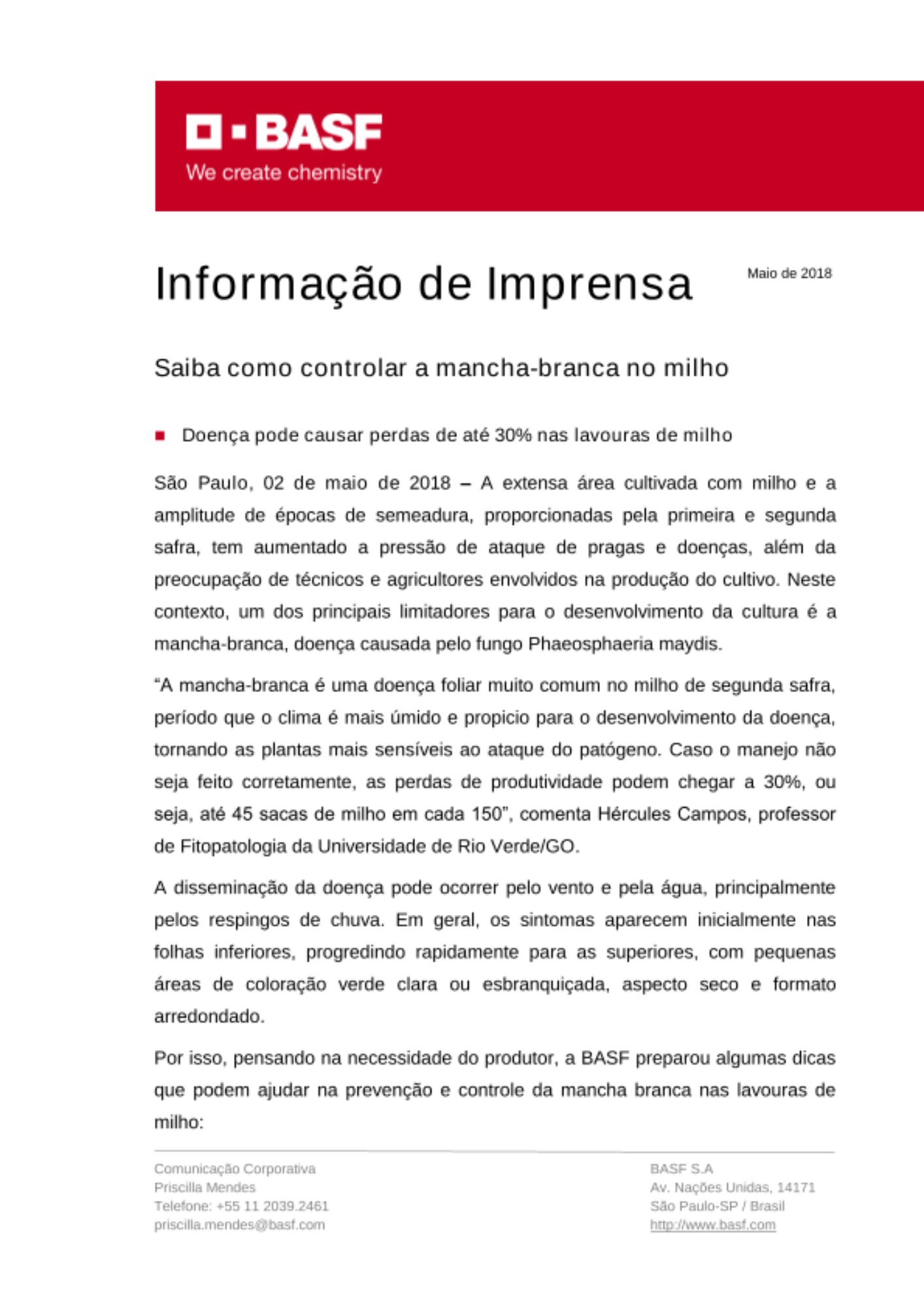 “A BASF possui um portfólio completo para o manejo de pragas e doenças no milho. Destaque para os fungicidas Abacus®HC e Ativum® com diferentes modos de ação, a solução é ideal para o manejo de resistência, contribuindo para o aumento da produtividade, qualidade e rentabilidade dos grãos”, comenta Stael Prata, gerente de Marketing para a Cultura do Milho da BASF.