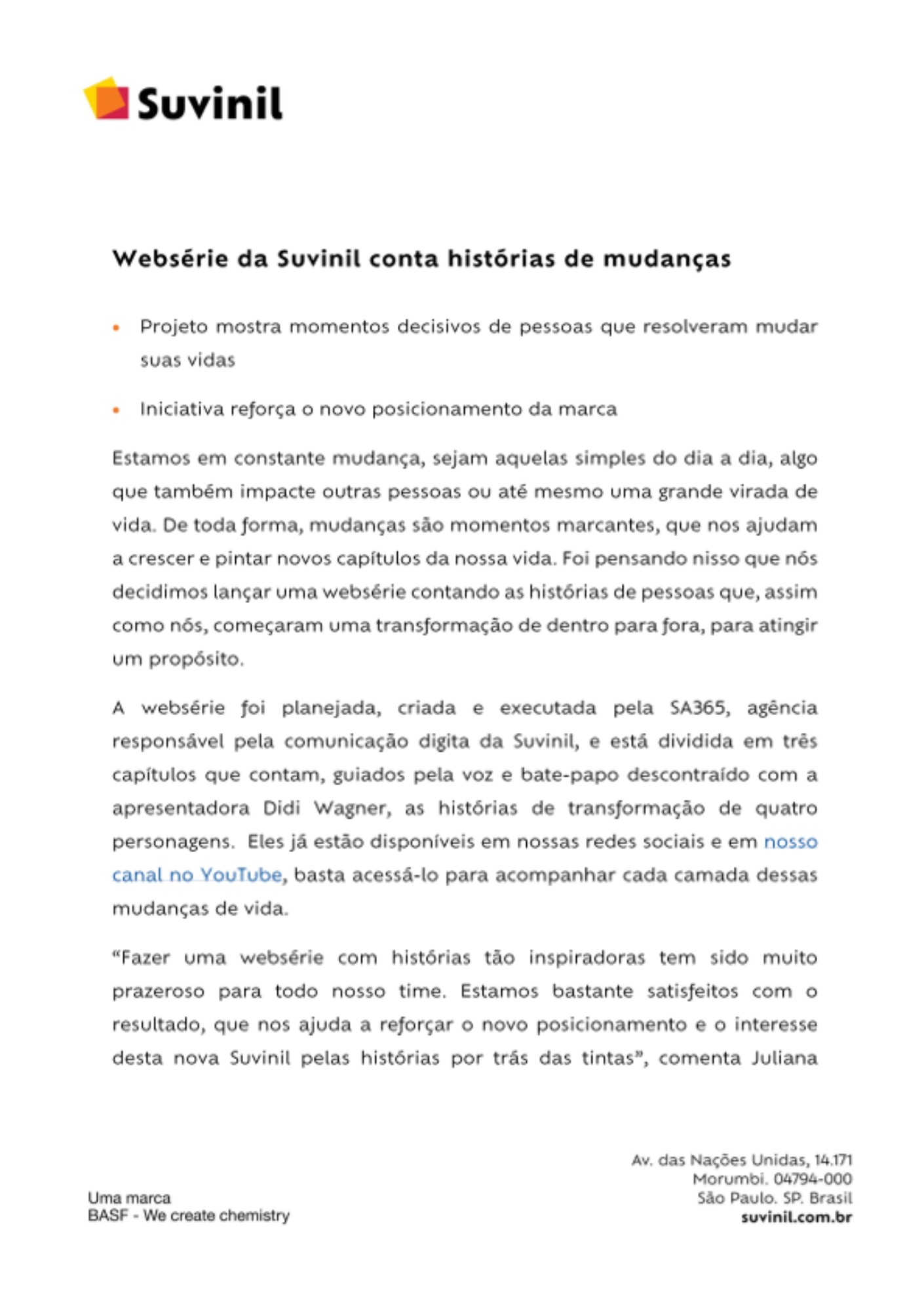 “Utilizamos histórias reais e inspiradoras para explicar a mudança da Suvinil. Uma mudança relevante, com impacto significativo na vida de todos que se relacionam com a marca. Nossa equipe está orgulhosa dos resultados, e cheia de energia por fazer parte desta transformação tão genuína”, finaliza Gui Rios, sócio fundador da SA365.