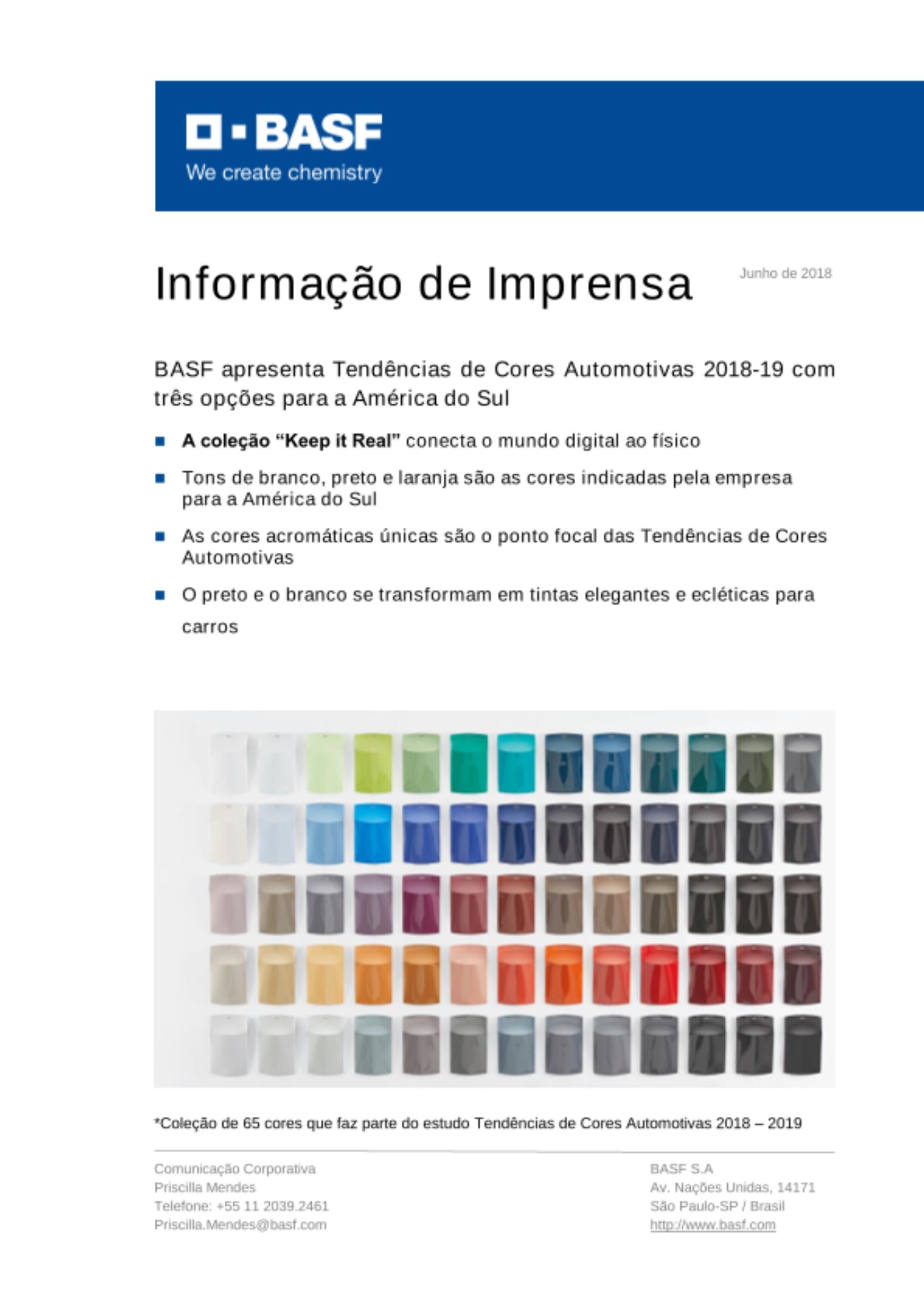 A BASF, a maior fornecedora química para a indústria automotiva global, divulga seu estudo de Tendências de Cores Automotivas 2018 – 2019, denominado “Keep it Real”. A força motriz por trás do tema do estudo é a necessidade de permanecer autêntico em um mundo onde a tecnologia continua a distorcer as linhas entre a realidade e a artificialidade.