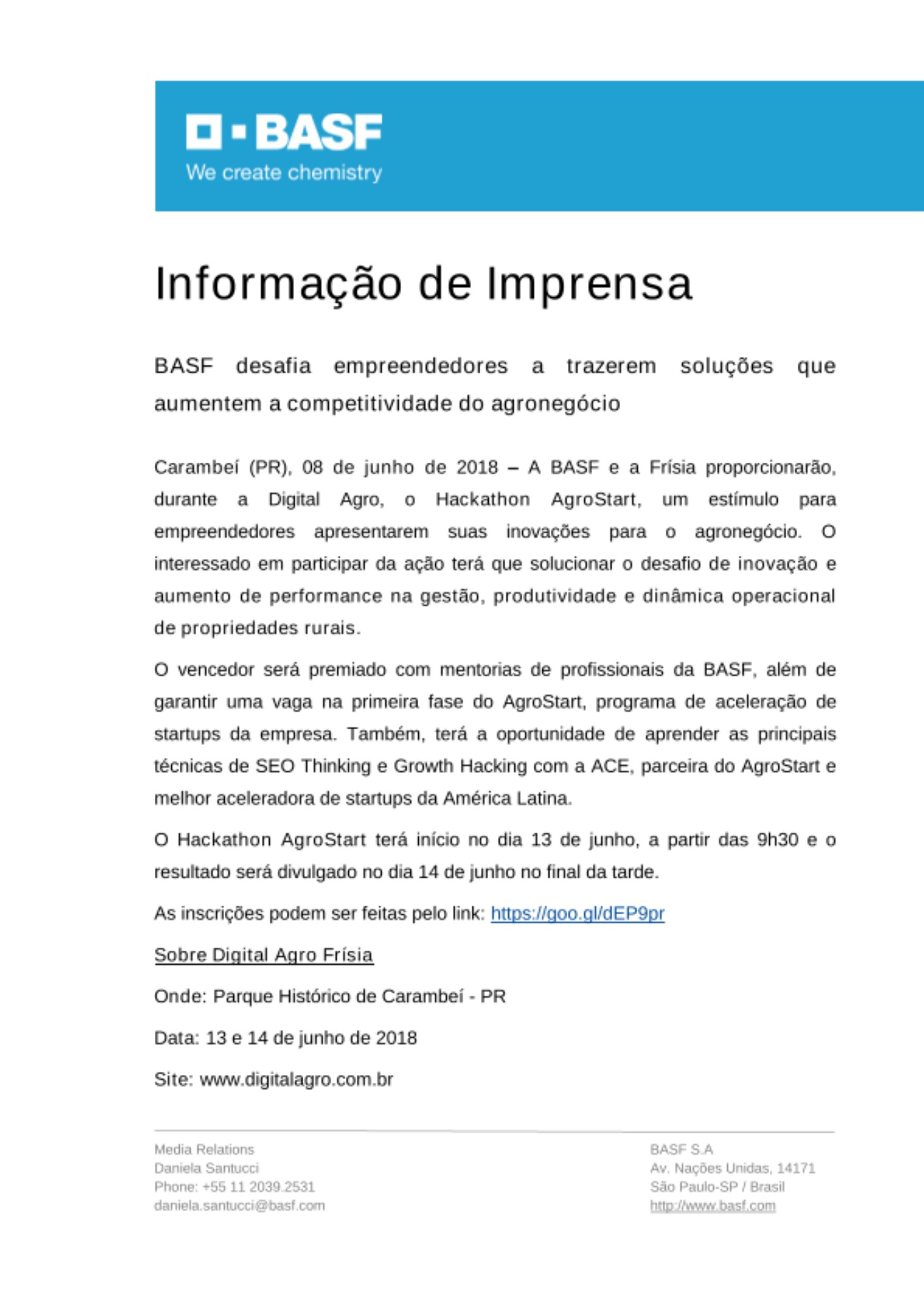A BASF e a Frísia proporcionarão, durante a Digital Agro, o Hackathon AgroStart, um estímulo para empreendedores apresentarem suas inovações para o agronegócio. O interessado em participar da ação terá que solucionar o desafio de inovação e aumento de performance na gestão, produtividade e dinâmica operacional de propriedades rurais. O vencedor será premiado com mentorias de profissionais da BASF, além de garantir uma vaga na primeira fase do AgroStart, programa de aceleração de startups da empresa. Também, terá a oportunidade de aprender as principais técnicas de SEO Thinking e Growth Hacking com a ACE, parceira do AgroStart e melhor aceleradora de startups da América Latina.