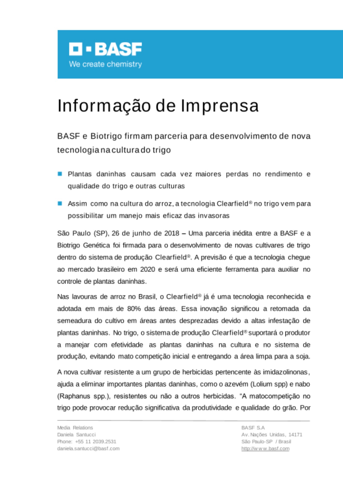 Uma parceria inédita entre a BASF e a Biotrigo Genética foi firmada para o desenvolvimento de novas cultivares de trigo dentro do sistema de produção Clearfield®. A previsão é que a tecnologia chegue ao mercado brasileiro em 2020 e será uma eficiente ferramenta para auxiliar no controle de plantas daninhas.