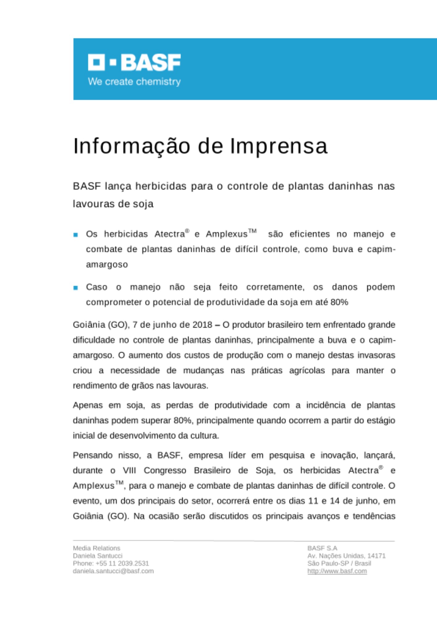 Pensando nisso, a BASF, empresa líder em pesquisa e inovação, lançará, durante o VIII Congresso Brasileiro de Soja, os herbicidas Atectra® e AmplexusTM, para o manejo e combate de plantas daninhas de difícil controle. O evento, um dos principais do setor, ocorrerá entre os dias 11 e 14 de junho, em Goiânia (GO). Na ocasião serão discutidos os principais avanços e tendências dos sistemas de produção que devem transformar o agronegócio nos próximos anos.