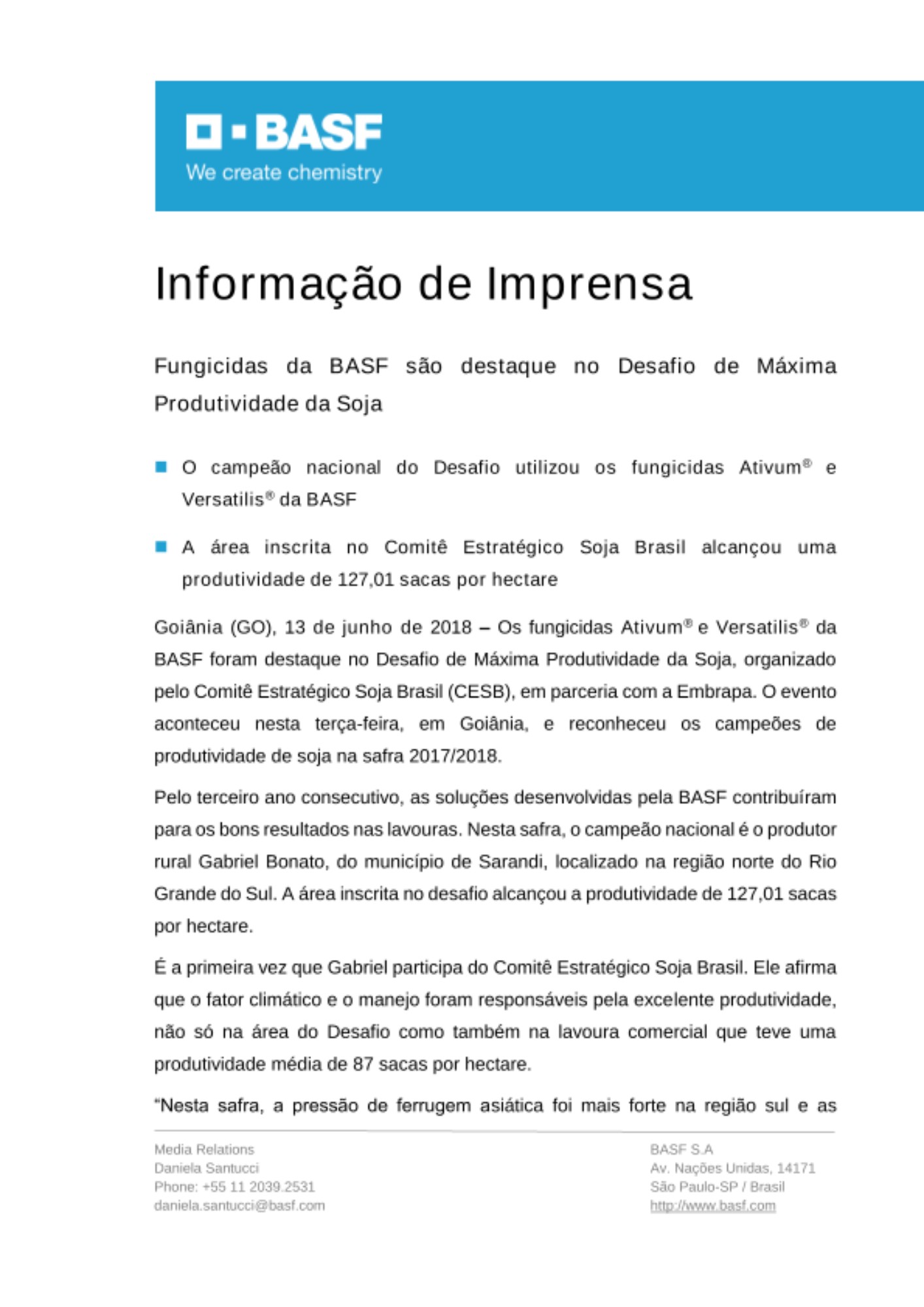 Prezado jornalista, favor contatar a BASF, por meio de sua área da Comunicação Corporativa, em caso de informações sobre os produtos e sua correta aplicação. Uso exclusivamente agrícola. Aplique somente as doses recomendadas. Descarte corretamente as embalagens e restos de produtos. Incluir outros métodos de controle do programa do Manejo Integrado de Pragas (MIP) quando disponíveis e apropriados. Os produtos Versatilis®e Ativum® estão devidamente registrados no Ministério da Agricultura, Pecuária e Abastecimento sob os números: 01188593 e 11216.
