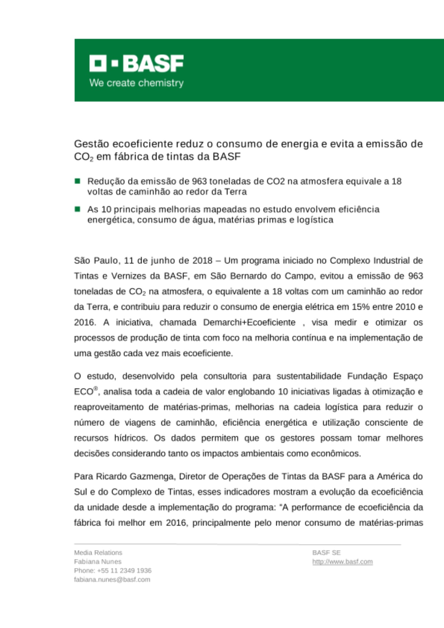 Um programa iniciado no Complexo Industrial de Tintas e Vernizes da BASF, em São Bernardo do Campo, evitou a emissão de 963 toneladas de CO2 na atmosfera, o equivalente a 18 voltas com um caminhão ao redor da Terra, e contribuiu para reduzir o consumo de energia elétrica em 15% entre 2010 e 2016. A iniciativa, chamada Demarchi+Ecoeficiente, visa medir e otimizar os processos de produção de tinta com foco na melhoria contínua e na implementação de uma gestão cada vez mais ecoeficiente.