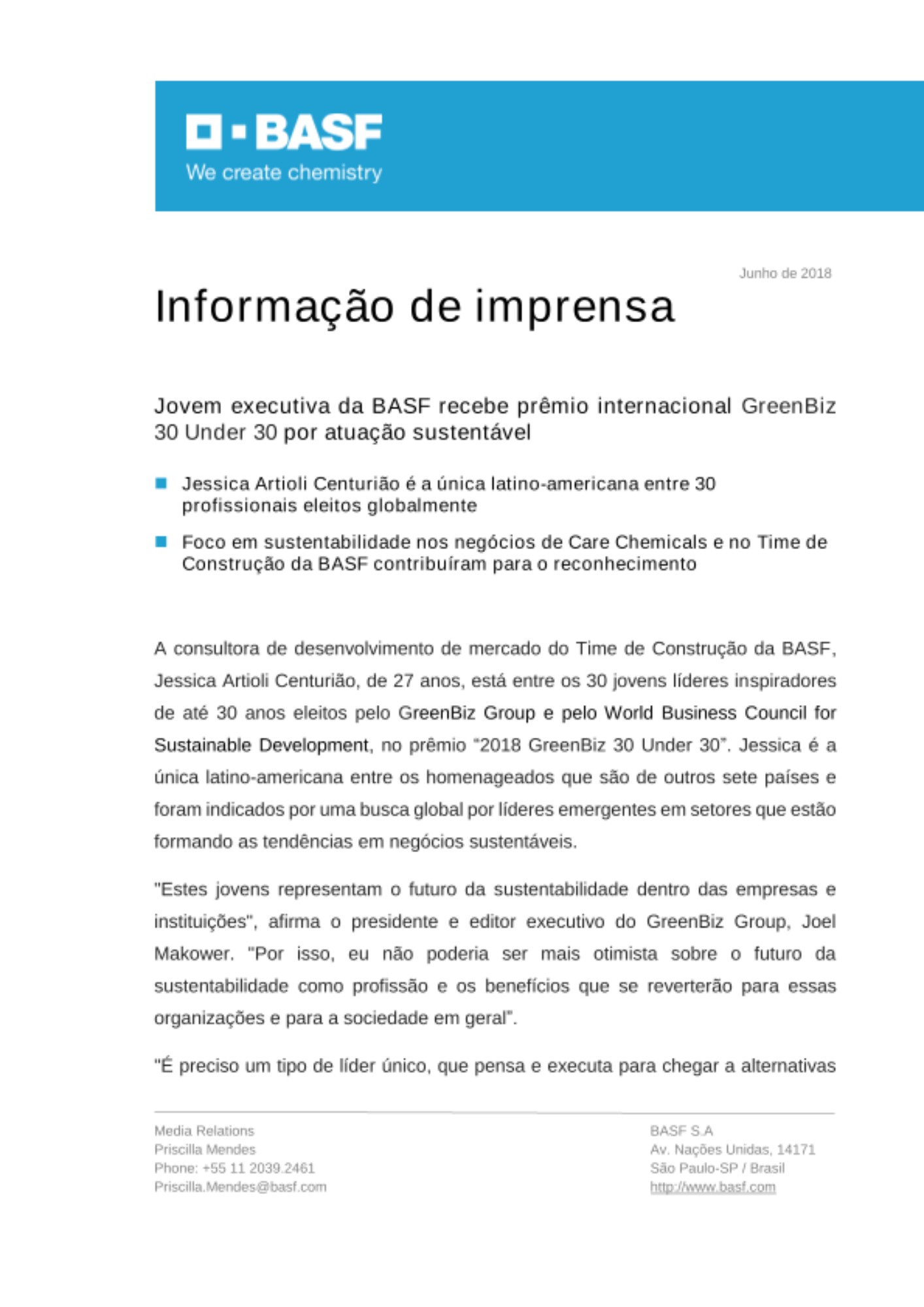 A consultora de desenvolvimento de mercado do Time de Construção da BASF, Jessica Artioli Centurião, de 27 anos, está entre os 30 jovens líderes inspiradores de até 30 anos eleitos pelo GreenBiz Group e pelo World Business Council for Sustainable Development, no prêmio “2018 GreenBiz 30 Under 30”. Jessica é a única latino-americana entre os homenageados que são de outros sete países e foram indicados por uma busca global por líderes emergentes em setores que estão formando as tendências em negócios sustentáveis.