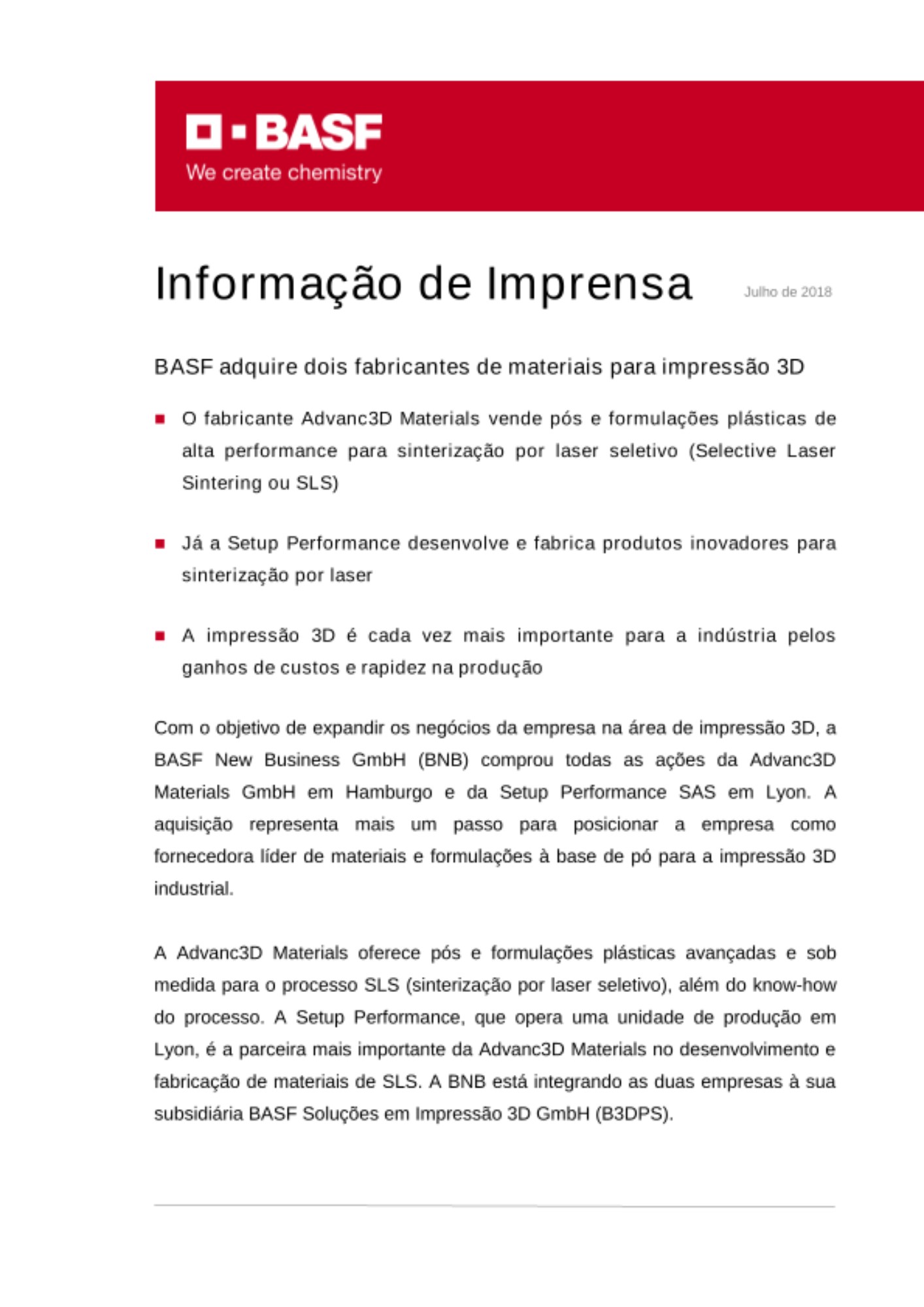 Com o objetivo de expandir os negócios da empresa na área de impressão 3D, a BASF New Business GmbH (BNB) comprou todas as ações da Advanc3D Materials GmbH em Hamburgo e da Setup Performance SAS em Lyon. A aquisição representa mais um passo para posicionar a empresa como fornecedora líder de materiais e formulações à base de pó para a impressão 3D industrial.