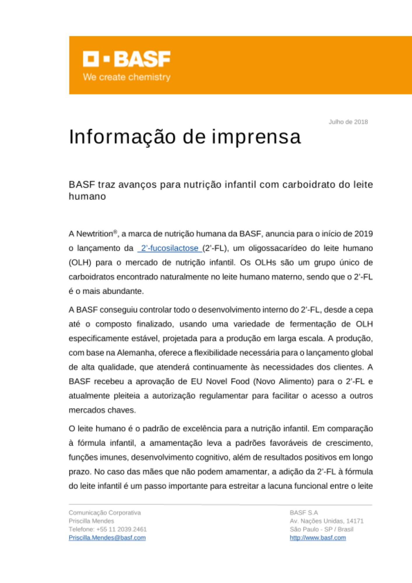 A Newtrition®, a marca de nutrição humana da BASF, anuncia para o início de 2019 o lançamento da 2’-fucosilactose (2’-FL), um oligossacarídeo do leite humano (OLH) para o mercado de nutrição infantil. Os OLHs são um grupo único de carboidratos encontrado naturalmente no leite humano materno, sendo que o 2’-FL é o mais abundante.