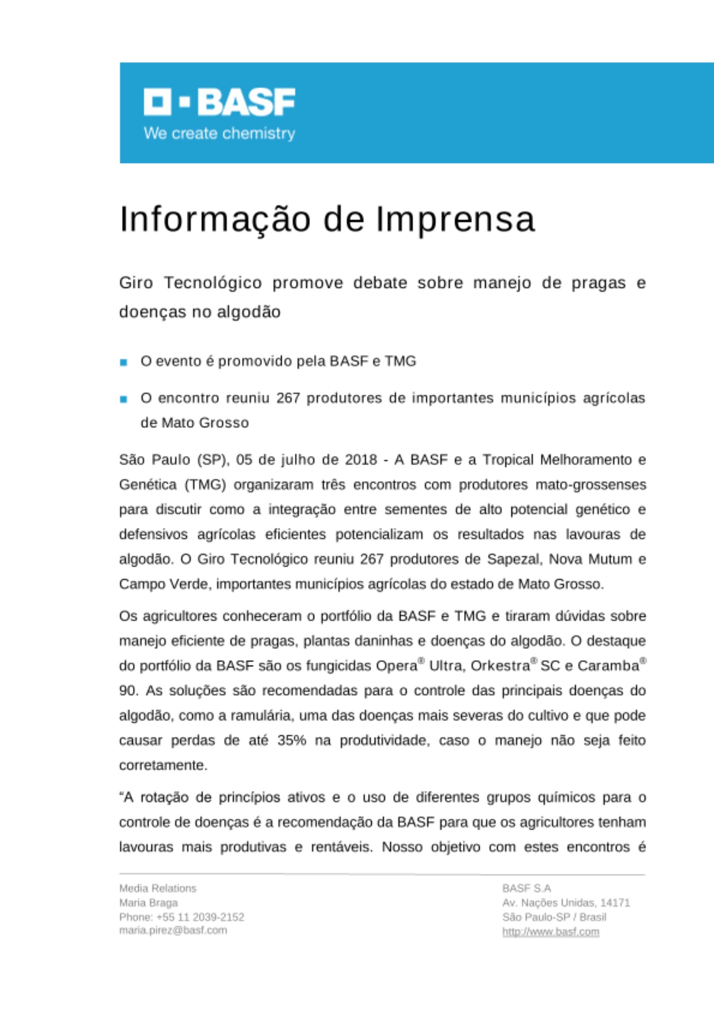 A BASF e a Tropical Melhoramento e Genética (TMG) organizaram três encontros com produtores mato-grossenses para discutir como a integração entre sementes de alto potencial genético e defensivos agrícolas eficientes potencializam os resultados nas lavouras de algodão. O Giro Tecnológico reuniu 267 produtores de Sapezal, Nova Mutum e Campo Verde, importantes municípios agrícolas do estado de Mato Grosso. Os agricultores conheceram o portfólio da BASF e TMG e tiraram dúvidas sobre manejo eficiente de pragas, plantas daninhas e doenças do algodão. O destaque do portfólio da BASF são os fungicidas Opera® Ultra, Orkestra® SC e Caramba® 90. As soluções são recomendadas para o controle das principais doenças do algodão, como a ramulária, uma das doenças mais severas do cultivo e que pode causar perdas de até 35% na produtividade, caso o manejo não seja feito corretamente. “A rotação de princípios ativos e o uso de diferentes grupos químicos para o controle de doenças é a recomendação da BASF para que os agricultores tenham lavouras mais produtivas e rentáveis. Nosso objetivo com estes encontros é promover conteúdo que auxilie os produtores na longevidade dos negócios, por meio da troca de experiência e conteúdos entre os participantes”, comenta Luiz Fernando Straioto, gerente de Marketing de Algodão da BASF. A TMG apresentou seu portfólio de cultivares de algodão, com destaque para a TMG 81WS e TMG 47B2RF e para os lançamentos TMG 44B2RF e TMG 62RF, essa última como opção para áreas de refúgio. Durante os encontros, Renan Santos, supervisor de Desenvolvimento de Mercado da TMG, destacou que as projeções indicam crescimento de área plantada para a safra de algodão 2018/19 e a cultivar TMG 81WS é umas das melhores opções para essa condição de plantio sobre áreas de soja/milho, devido ao seu sistema radicular agressivo e crescimento vigoroso. “Para o manejo da principal doença do algodoeiro, a Ramulária, a TMG também oferece ao mercado três cultivares com a tecnologia RX, que confere tolerância à doença e está presente na TMG 44B2RF, TMG 47B2RF e TMG 62RF. Soma-se a isso o alto potencial produtivo e a excelente qualidade de fibra dessas cultivares”, pontuou Renan. O Giro Tecnológico também contou com a participação de especialistas em manejo fitossanitário. O pesquisador da Fundação MT, Leandro Zancanaro, falou sobre o manejo correto de solos para assegurar uma boa fertilidade. Já Fábio Echer, pesquisador da Unoeste, destacou a importância da fisiologia das plantas para a qualidade do cultivo. Prezado jornalista, favor contatar a BASF, por meio de sua área da Comunicação Corporativa, em caso de informações sobre os produtos e sua correta aplicação. Uso exclusivamente agrícola. Aplique somente as doses recomendadas. Descarte corretamente as embalagens e restos de produtos. Incluir outros métodos de controle do programa do Manejo Integrado de Pragas (MIP) quando disponíveis e apropriados. Opera® Ultra, Orkestra® SC e Caramba® 90 estão devidamente registrados no Ministério da Agricultura, Pecuária e Abastecimento sob os números 9310, 08813 e 01601.