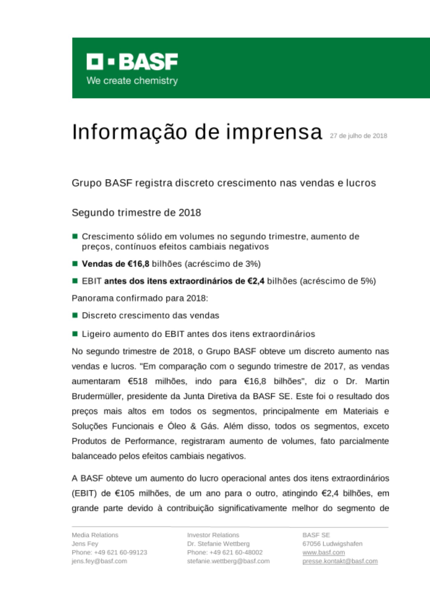 No segundo trimestre de 2018, o Grupo BASF obteve um discreto aumento nas vendas e lucros. "Em comparação com o segundo trimestre de 2017, as vendas aumentaram €518 milhões, indo para €16,8 bilhões", diz o Dr. Martin Brudermüller, presidente da Junta Diretiva da BASF SE. Este foi o resultado dos preços mais altos em todos os segmentos, principalmente em Materiais e Soluções Funcionais e Óleo & Gás. Além disso, todos os segmentos, exceto Produtos de Performance, registraram aumento de volumes, fato parcialmente balanceado pelos efeitos cambiais negativos.