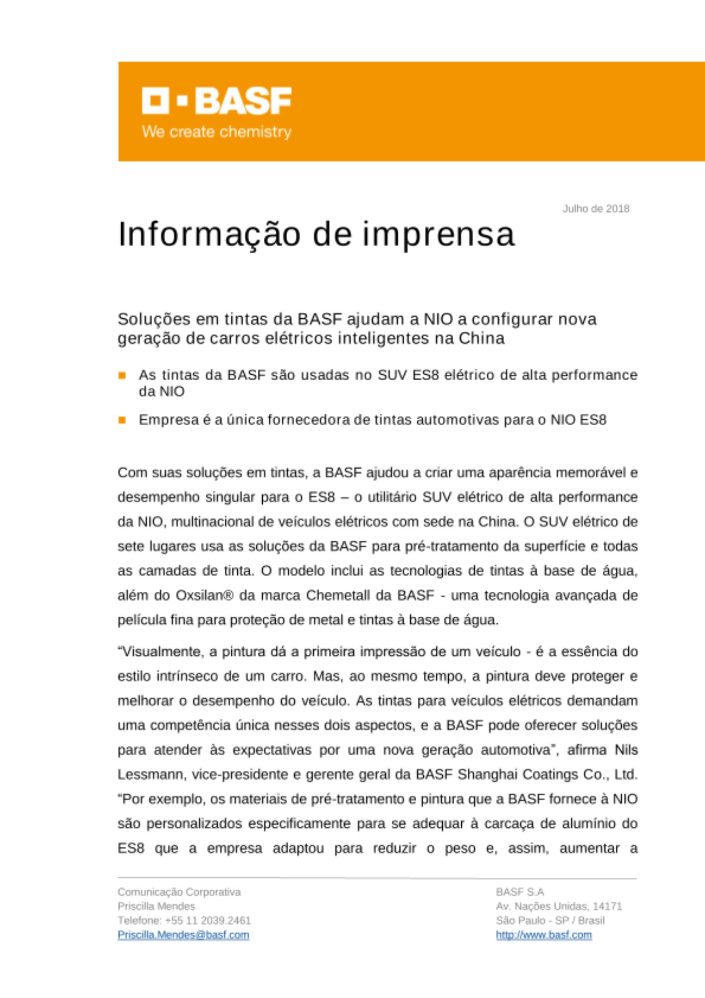 Com suas soluções em tintas, a BASF ajudou a criar uma aparência memorável e desempenho singular para o ES8 – o utilitário SUV elétrico de alta performance da NIO, multinacional de veículos elétricos com sede na China. O SUV elétrico de sete lugares usa as soluções da BASF para pré-tratamento da superfície e todas as camadas de tinta. O modelo inclui as tecnologias de tintas à base de água, além do Oxsilan® da marca Chemetall da BASF - uma tecnologia avançada de película fina para proteção de metal e tintas à base de água.