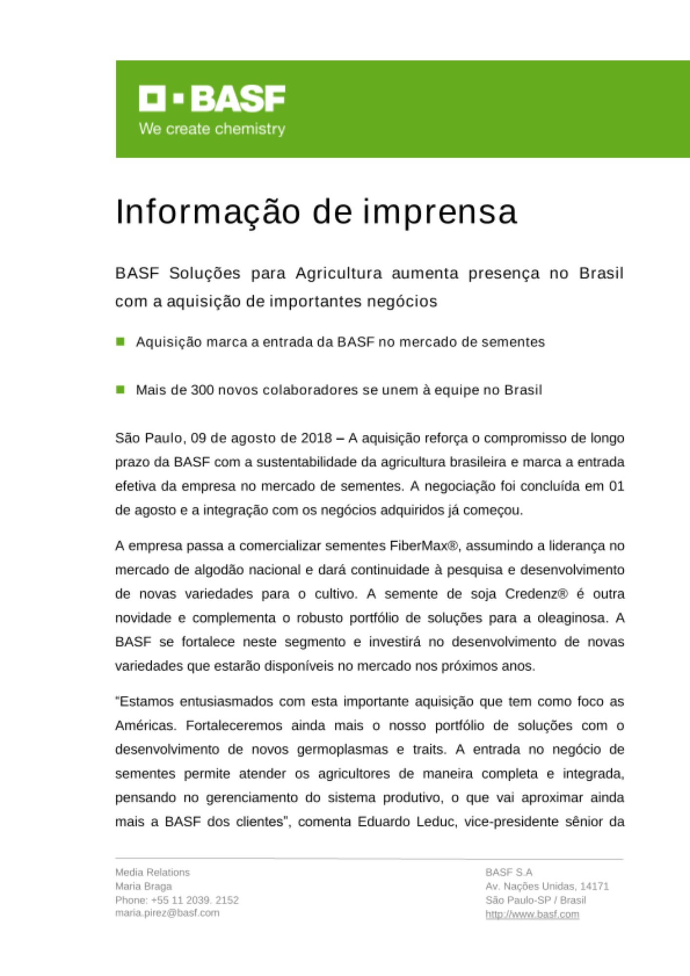 A aquisição reforça o compromisso de longo prazo da BASF com a sustentabilidade da agricultura brasileira e marca a entrada efetiva da empresa no mercado de sementes. A negociação foi concluída em 01 de agosto e a integração com os negócios adquiridos já começou.