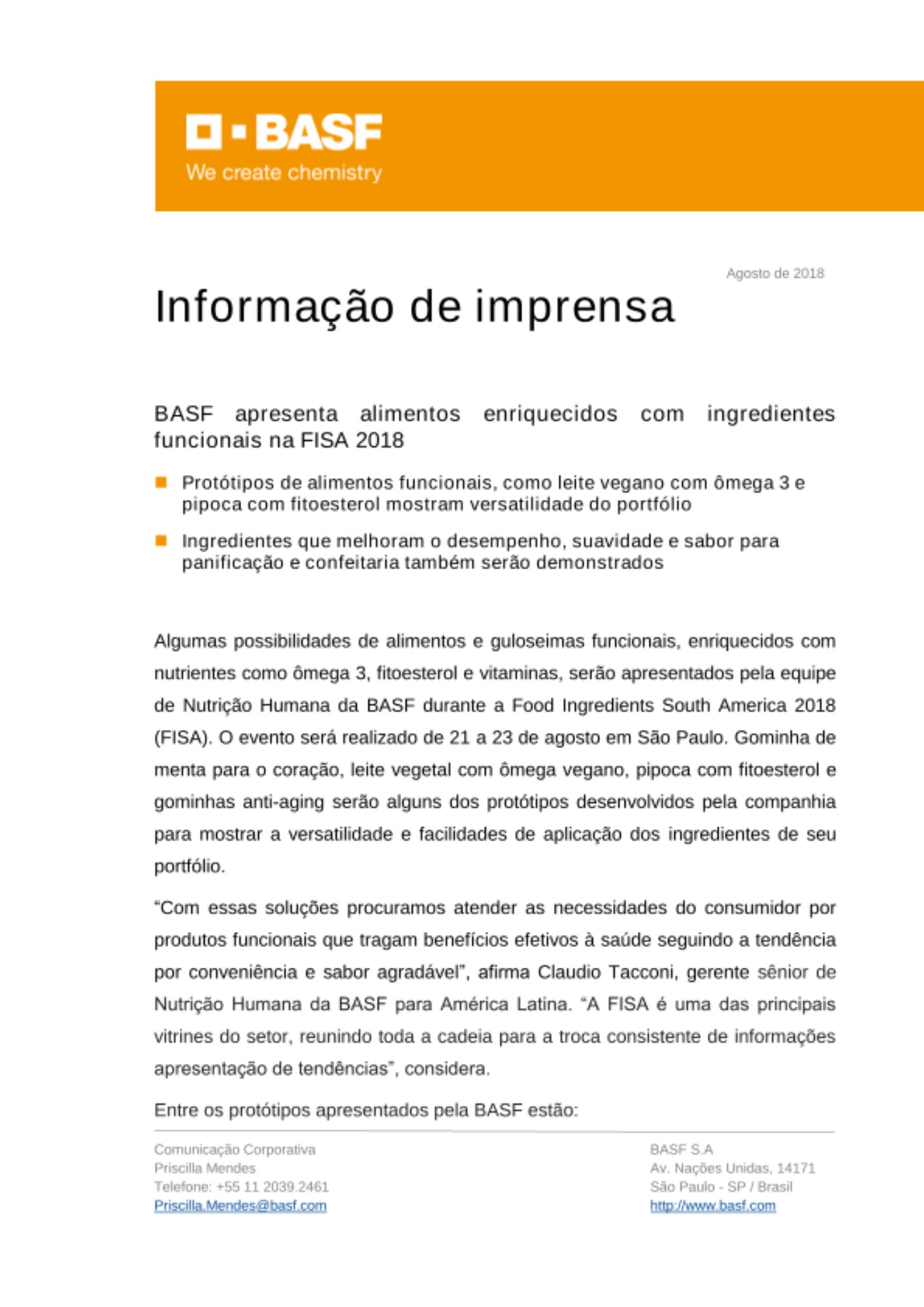 Algumas possibilidades de alimentos e guloseimas funcionais, enriquecidos com nutrientes como ômega 3, fitoesterol e vitaminas, serão apresentados pela equipe de Nutrição Humana da BASF durante a Food Ingredients South America 2018 (FISA). O evento será realizado de 21 a 23 de agosto em São Paulo. Gominha de menta para o coração, leite vegetal com ômega vegano, pipoca com fitoesterol e gominhas anti-aging serão alguns dos protótipos desenvolvidos pela companhia para mostrar a versatilidade e facilidades de aplicação dos ingredientes de seu portfólio.