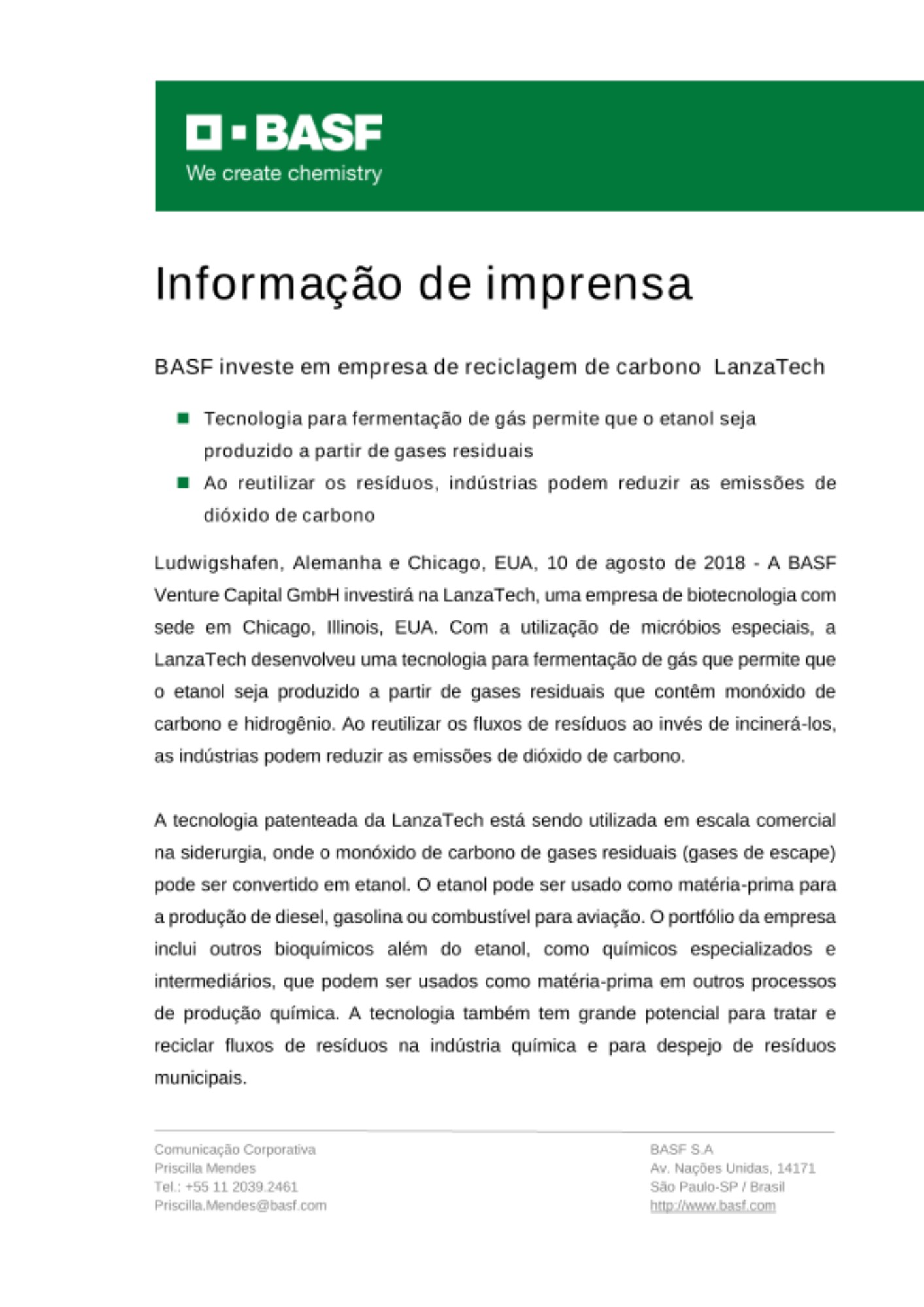 A BASF Venture Capital GmbH investirá na LanzaTech, uma empresa de biotecnologia com sede em Chicago, Illinois, EUA. Com a utilização de micróbios especiais, a LanzaTech desenvolveu uma tecnologia para fermentação de gás que permite que o etanol seja produzido a partir de gases residuais que contêm monóxido de carbono e hidrogênio. Ao reutilizar os fluxos de resíduos ao invés de incinerá-los, as indústrias podem reduzir as emissões de dióxido de carbono.