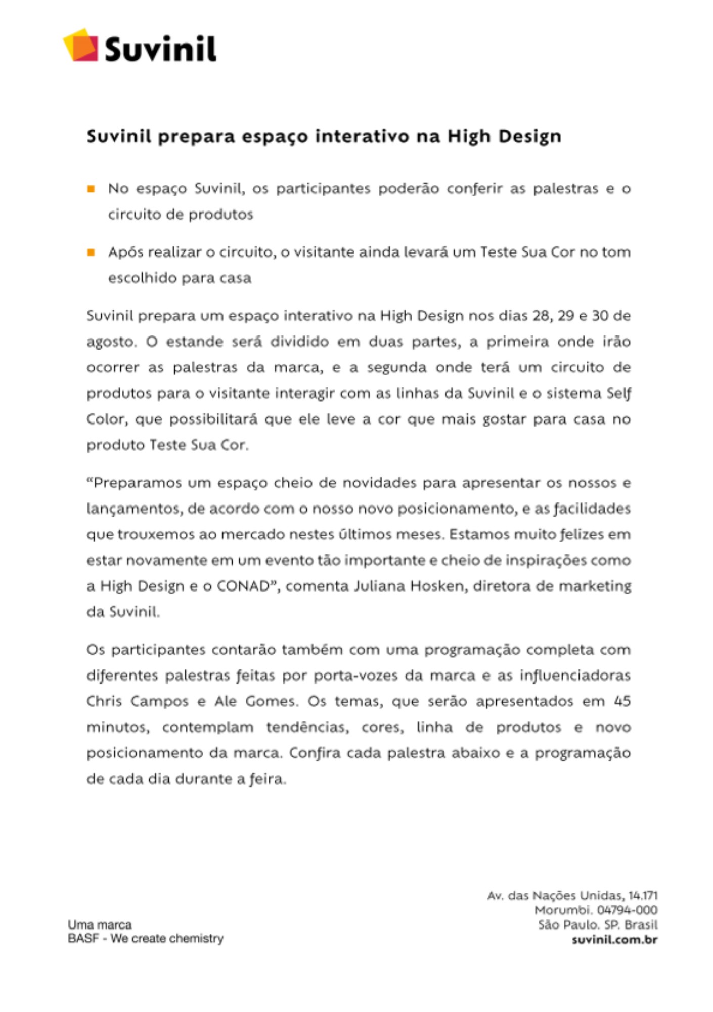 Suvinil prepara um espaço interativo na High Design nos dias 28, 29 e 30 de agosto. O estande será dividido em duas partes, a primeira onde irão ocorrer as palestras da marca, e a segunda onde terá um circuito de produtos para o visitante interagir com as linhas da Suvinil e o sistema Self Color, que possibilitará que ele leve a cor que mais gostar para casa no produto Teste Sua Cor.