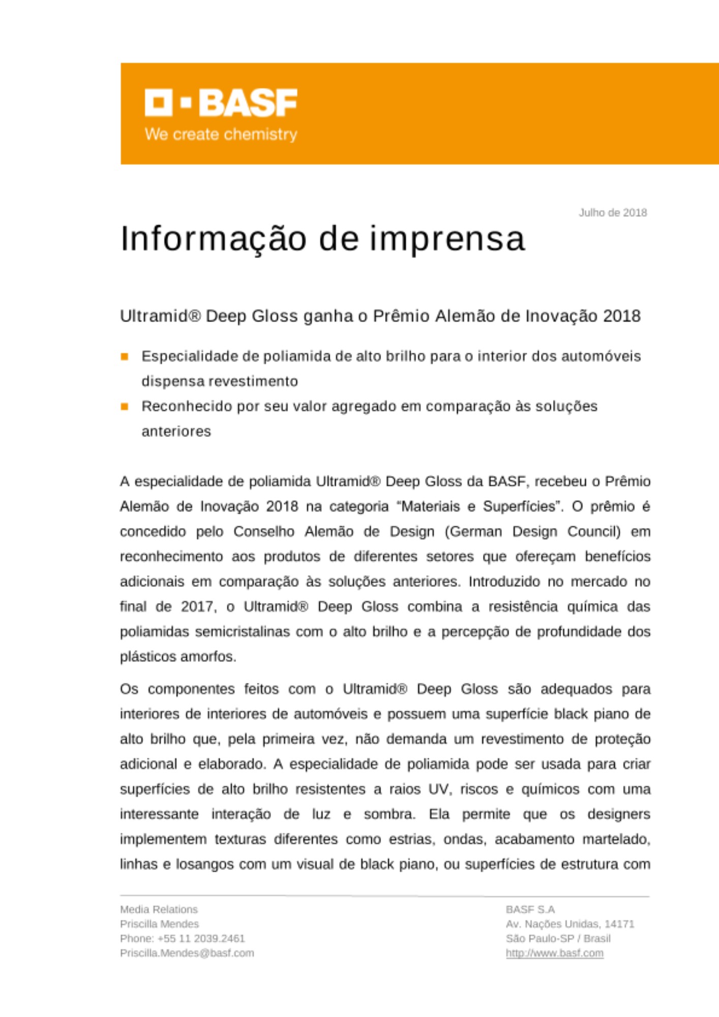 A especialidade de poliamida Ultramid® Deep Gloss da BASF, recebeu o Prêmio Alemão de Inovação 2018 na categoria “Materiais e Superfícies”. O prêmio é concedido pelo Conselho Alemão de Design (German Design Council) em reconhecimento aos produtos de diferentes setores que ofereçam benefícios adicionais em comparação às soluções anteriores. Introduzido no mercado no final de 2017, o Ultramid® Deep Gloss combina a resistência química das poliamidas semicristalinas com o alto brilho e a percepção de profundidade dos plásticos amorfos.
