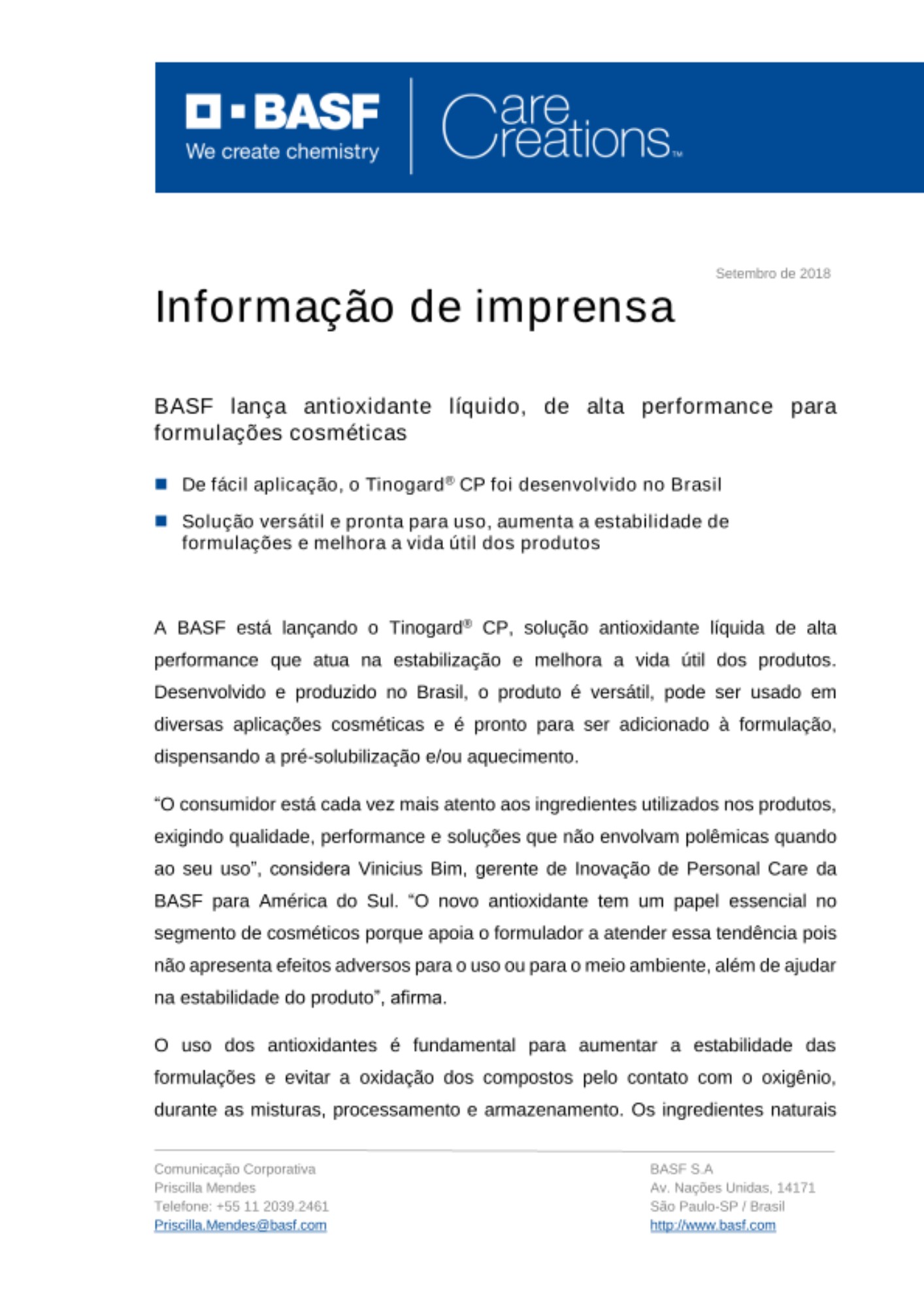 A BASF está lançando o Tinogard® CP, solução antioxidante líquida de alta performance que atua na estabilização e melhora a vida útil dos produtos. Desenvolvido e produzido no Brasil, o produto é versátil, pode ser usado em diversas aplicações cosméticas e é pronto para ser adicionado à formulação, dispensando a pré-solubilização e/ou aquecimento.