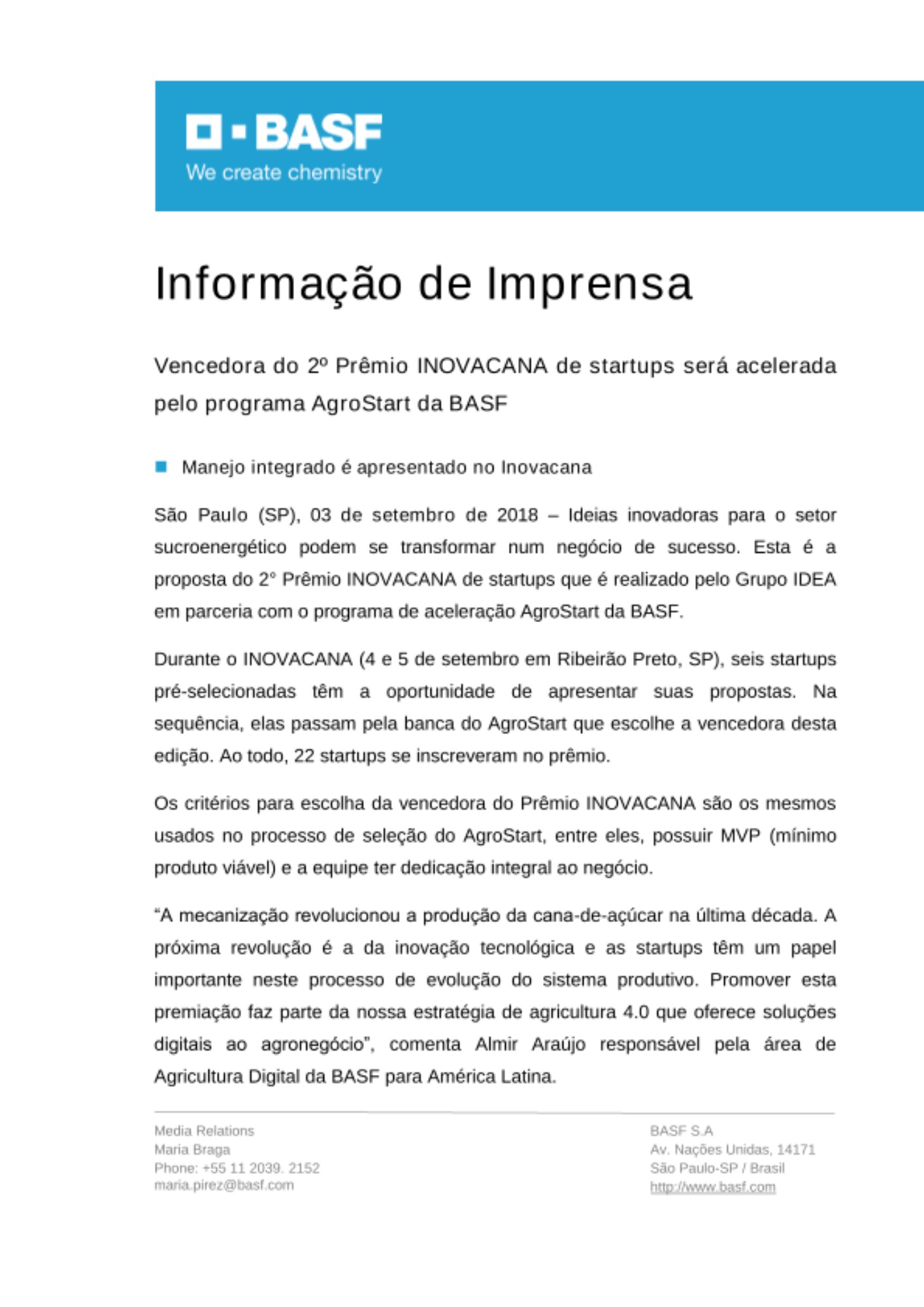 “A mecanização revolucionou a produção da cana-de-açúcar na última década. A próxima revolução é a da inovação tecnológica e as startups têm um papel importante neste processo de evolução do sistema produtivo. Promover esta premiação faz parte da nossa estratégia de agricultura 4.0 que oferece soluções digitais ao agronegócio”, comenta Almir Araújo responsável pela área de Agricultura Digital da BASF para América Latina.