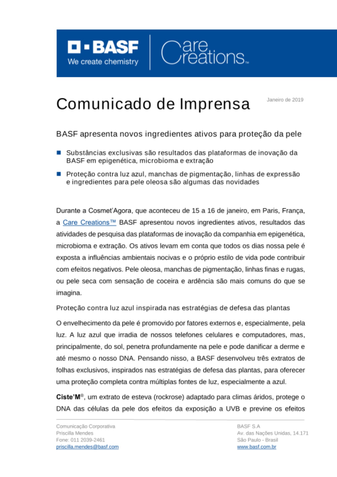 BASF apresenta novos ingredientes ativos para proteção da pele