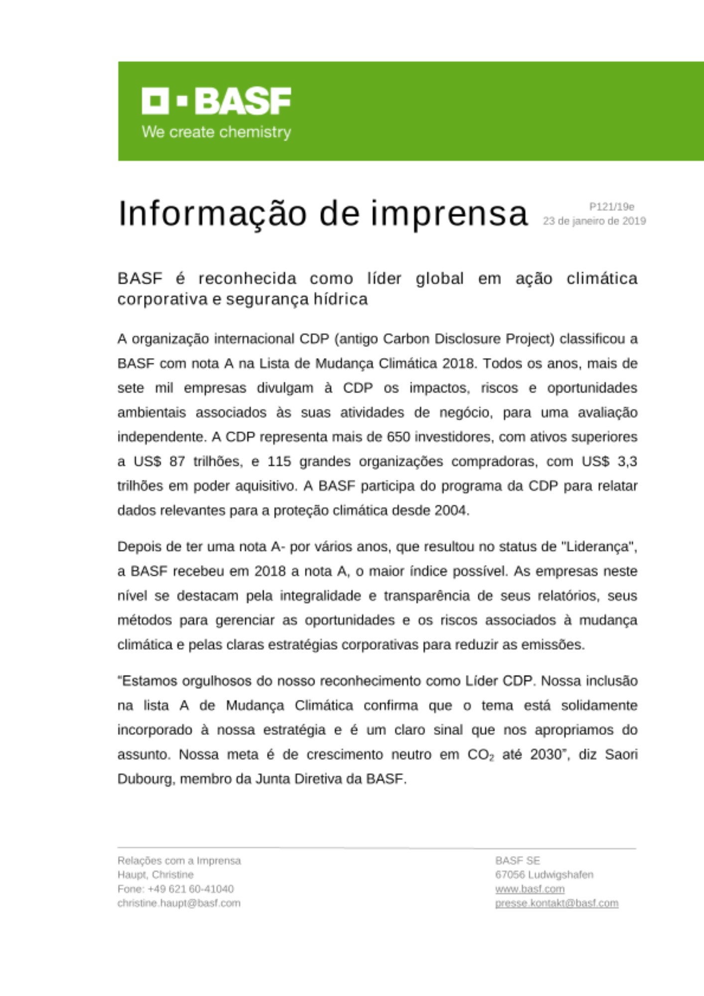 “Estamos orgulhosos do nosso reconhecimento como Líder CDP. Nossa inclusão na lista A de Mudança Climática confirma que o tema está solidamente incorporado à nossa estratégia e é um claro sinal que nos apropriamos do assunto. Nossa meta é de crescimento neutro em CO2 até 2030”, diz Saori Dubourg, membro da Junta Diretiva da BASF.