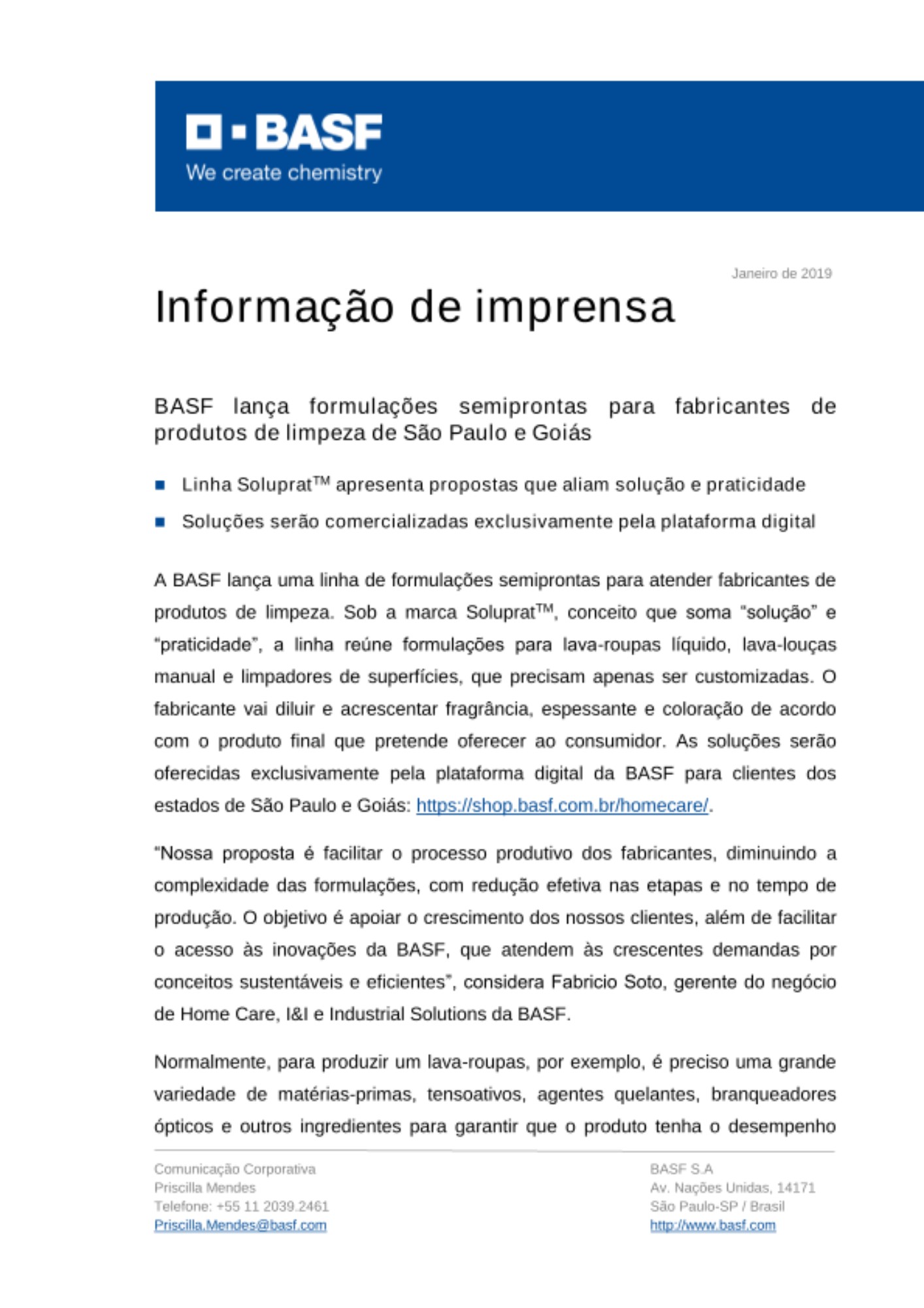 A BASF lança uma linha de formulações semiprontas para atender fabricantes de produtos de limpeza. Sob a marca SolupratTM, conceito que soma “solução” e “praticidade”, a linha reúne formulações para lava-roupas líquido, lava-louças manual e limpadores de superfícies, que precisam apenas ser customizadas. O fabricante vai diluir e acrescentar fragrância, espessante e coloração de acordo com o produto final que pretende oferecer ao consumidor. As soluções serão oferecidas exclusivamente pela plataforma digital da BASF para clientes dos estados de São Paulo e Goiás: https://shop.basf.com.br/homecare/.