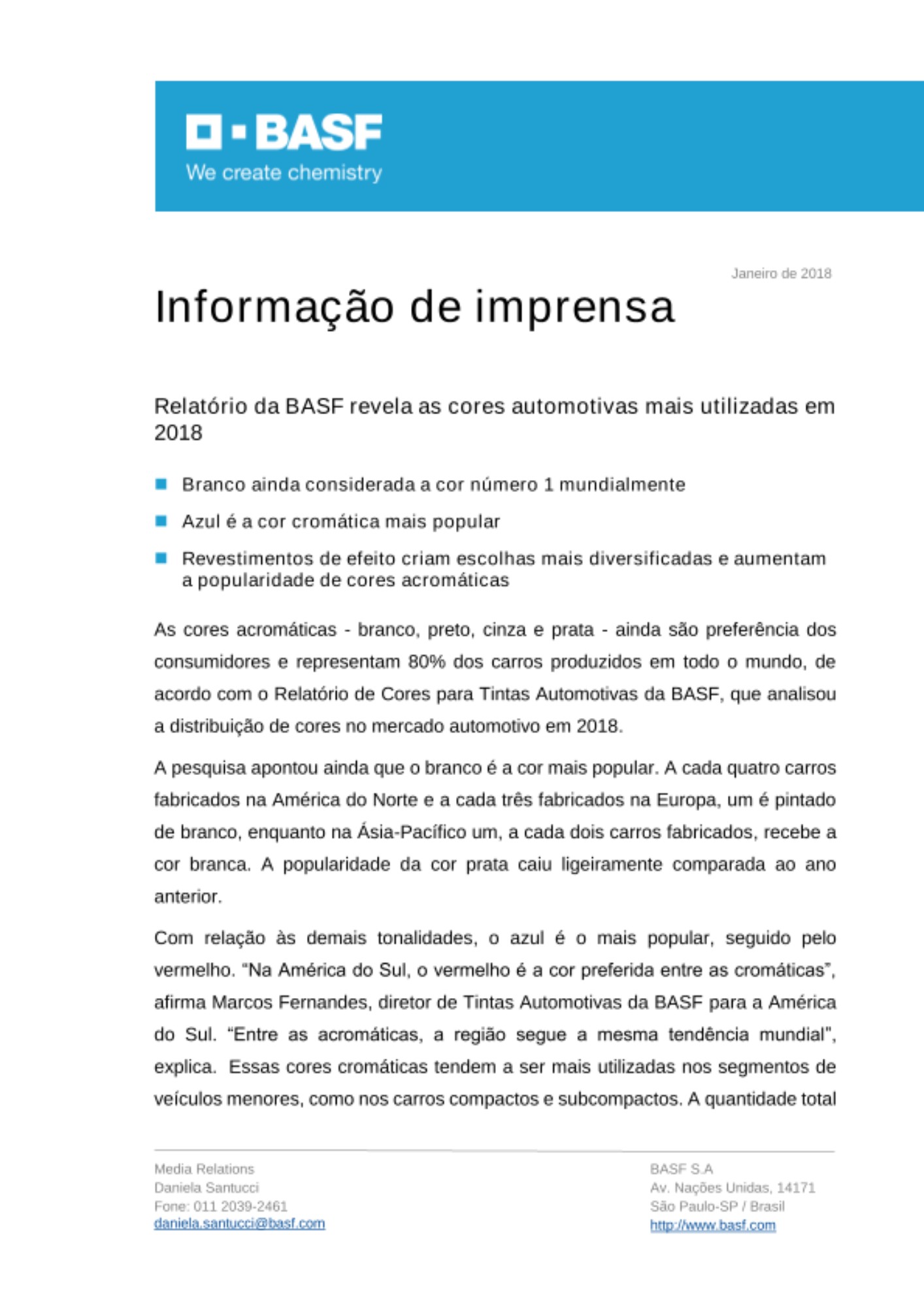 Com relação às demais tonalidades, o azul é o mais popular, seguido pelo vermelho. “Na América do Sul, o vermelho é a cor preferida entre as cromáticas”, afirma Marcos Fernandes, diretor de Tintas Automotivas da BASF para a América do Sul. “Entre as acromáticas, a região segue a mesma tendência mundial”, explica. Essas cores cromáticas tendem a ser mais utilizadas nos segmentos de veículos menores, como nos carros compactos e subcompactos. A quantidade total de tonalidades cromáticas apresentou queda significativa nos segmentos de veículos maiores, em que houve um aumento considerável do preto e branco em comparação ao ano anterior.
