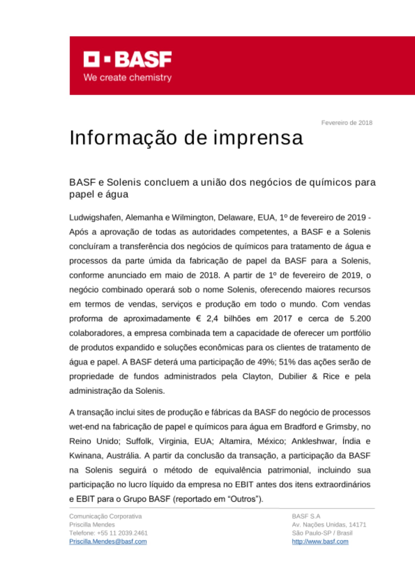 Após a aprovação de todas as autoridades competentes, a BASF e a Solenis concluíram a transferência dos negócios de químicos para tratamento de água e processos da parte úmida da fabricação de papel da BASF para a Solenis, conforme anunciado em maio de 2018. A partir de 1º de fevereiro de 2019, o negócio combinado operará sob o nome Solenis, oferecendo maiores recursos em termos de vendas, serviços e produção em todo o mundo. Com vendas proforma de aproximadamente € 2,4 bilhões em 2017 e cerca de 5.200 colaboradores, a empresa combinada tem a capacidade de oferecer um portfólio de produtos expandido e soluções econômicas para os clientes de tratamento de água e papel. A BASF deterá uma participação de 49%; 51% das ações serão de propriedade de fundos administrados pela Clayton, Dubilier & Rice e pela administração da Solenis.
