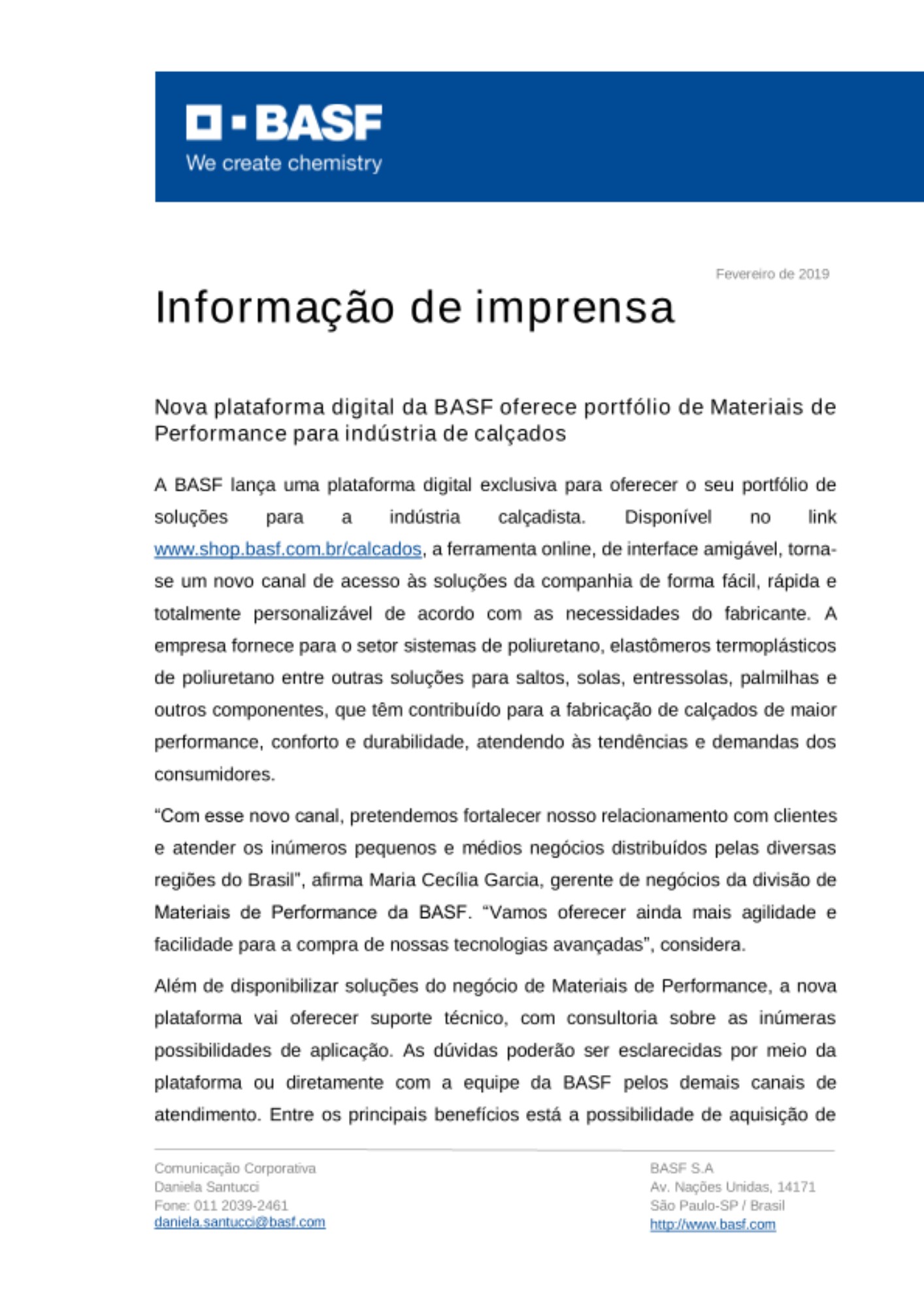 A BASF lança uma plataforma digital exclusiva para oferecer o seu portfólio de soluções para a indústria calçadista. Disponível no link www.shop.basf.com.br/calcados, a ferramenta online, de interface amigável, torna-se um novo canal de acesso às soluções da companhia de forma fácil, rápida e totalmente personalizável de acordo com as necessidades do fabricante. A empresa fornece para o setor sistemas de poliuretano, elastômeros termoplásticos de poliuretano entre outras soluções para saltos, solas, entressolas, palmilhas e outros componentes, que têm contribuído para a fabricação de calçados de maior performance, conforto e durabilidade, atendendo às tendências e demandas dos consumidores.