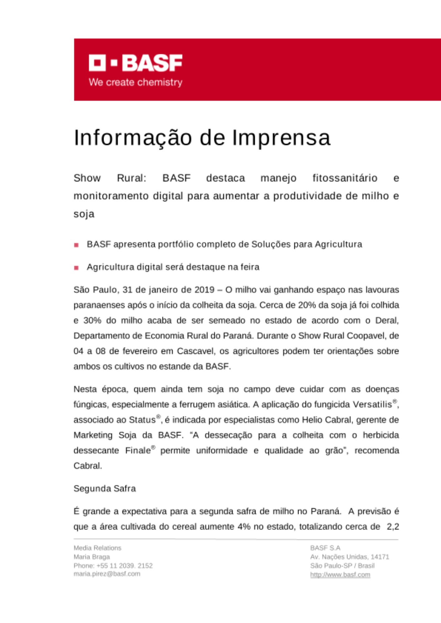 Prezado jornalista, favor contatar a BASF, por meio de sua área da Comunicação Corporativa, em caso de informações sobre os produtos e sua correta aplicação. Uso exclusivamente agrícola. Aplique somente as doses recomendadas. Descarte corretamente as embalagens e restos de produtos. Incluir outros métodos de controle do programa do Manejo Integrado de Pragas (MIP) quando disponíveis e apropriados. Versatilis®, Imunit®, Orkestra® SC, Abacus® HC, Status® e Finale® estão devidamente registrados no Ministério da Agricultura, Pecuária e Abastecimento respectivamente sob os números 01188593, 08806, 08813, 9210, 6210, 000691.
