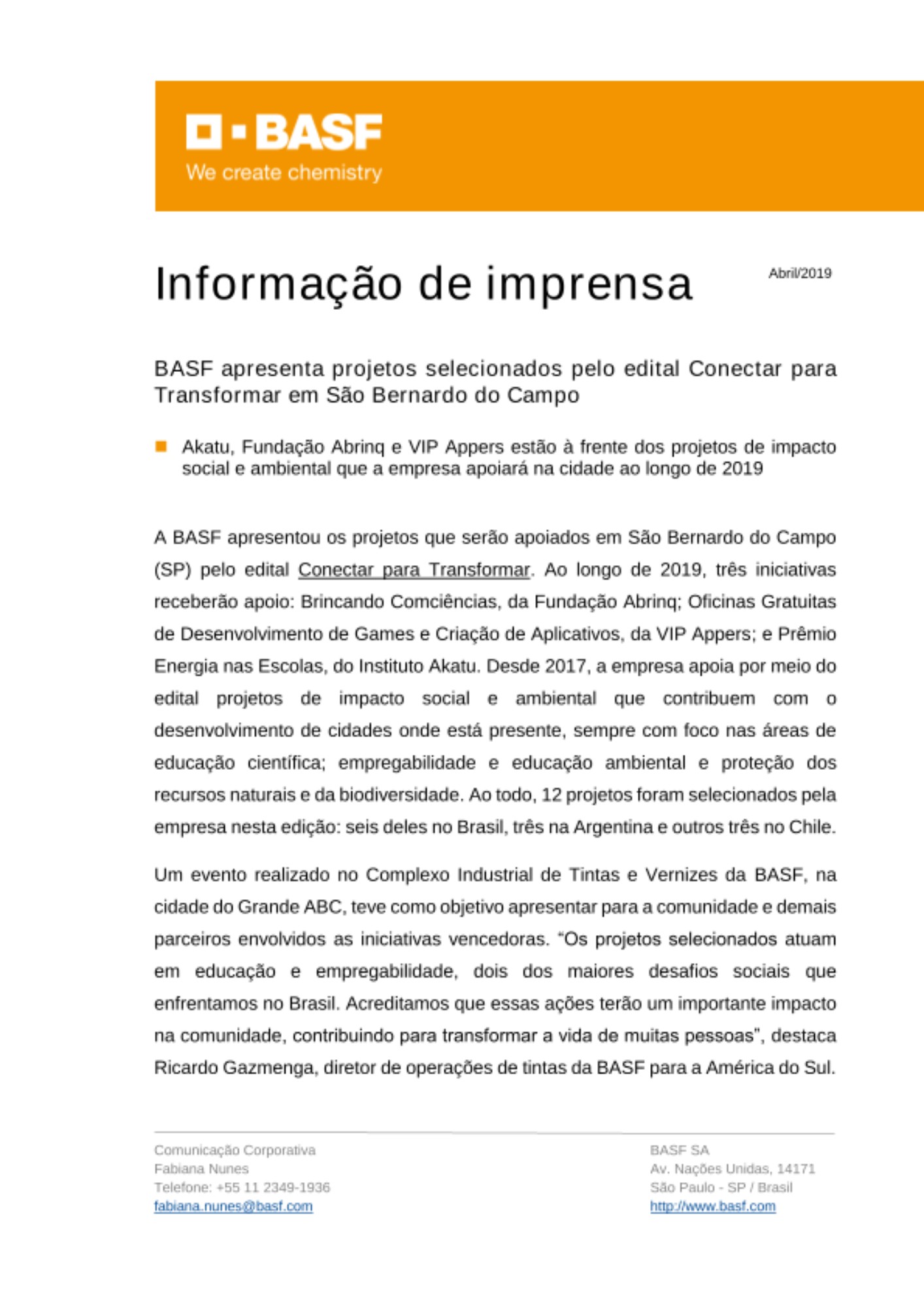 A BASF apresentou os projetos que serão apoiados em São Bernardo do Campo (SP) pelo edital Conectar para Transformar. Ao longo de 2019, três iniciativas receberão apoio: Brincando Comciências, da Fundação Abrinq; Oficinas Gratuitas de Desenvolvimento de Games e Criação de Aplicativos, da VIP Appers; e Prêmio Energia nas Escolas, do Instituto Akatu. Desde 2017, a empresa apoia por meio do edital projetos de impacto social e ambiental que contribuem com o desenvolvimento de cidades onde está presente, sempre com foco nas áreas de educação científica; empregabilidade e educação ambiental e proteção dos recursos naturais e da biodiversidade. Ao todo, 12 projetos foram selecionados pela empresa nesta edição: seis deles no Brasil, três na Argentina e outros três no Chile.