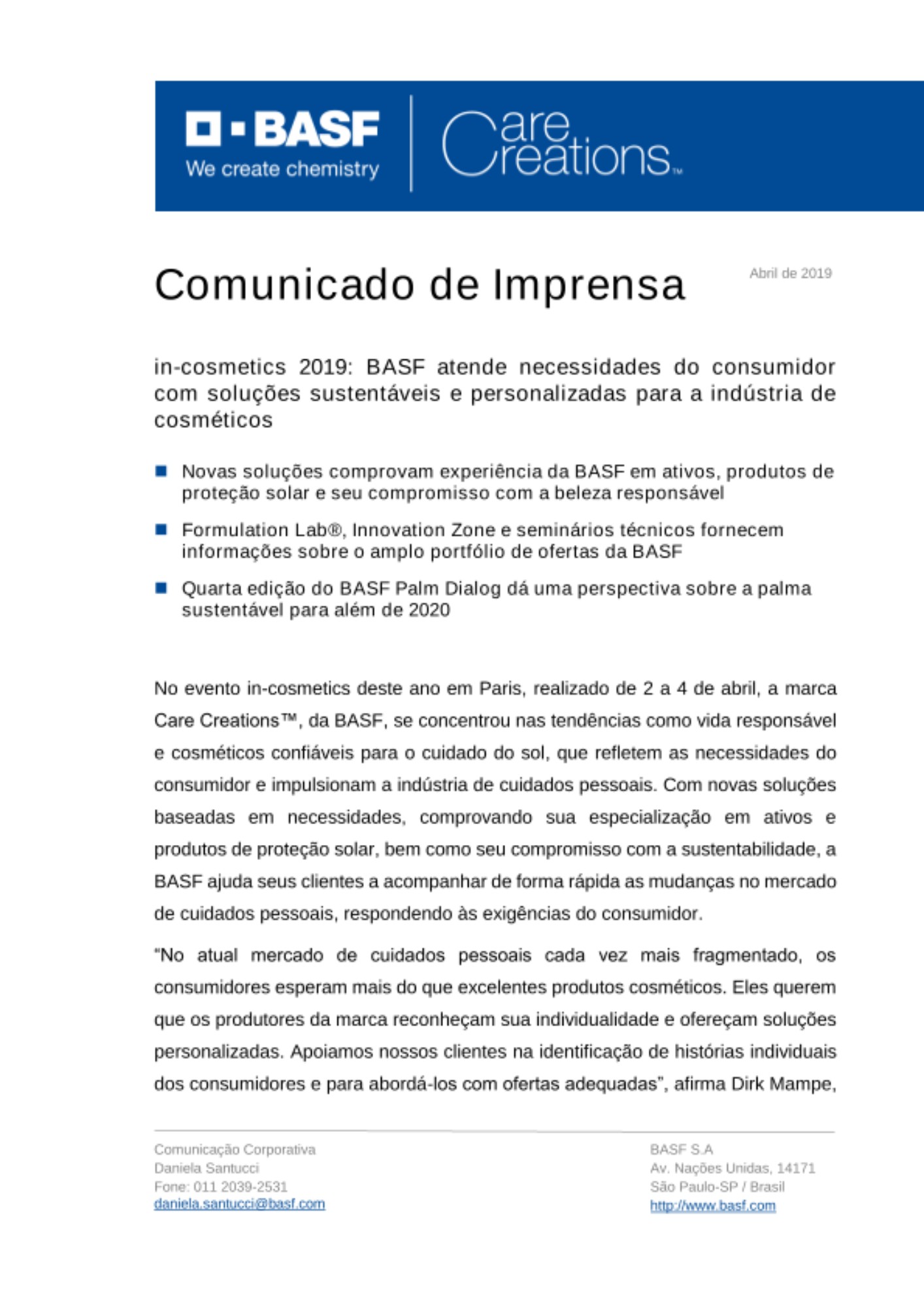 in-cosmetics 2019: BASF atende necessidades do consumidor com soluções sustentáveis e personalizadas para a indústria de cosméticos