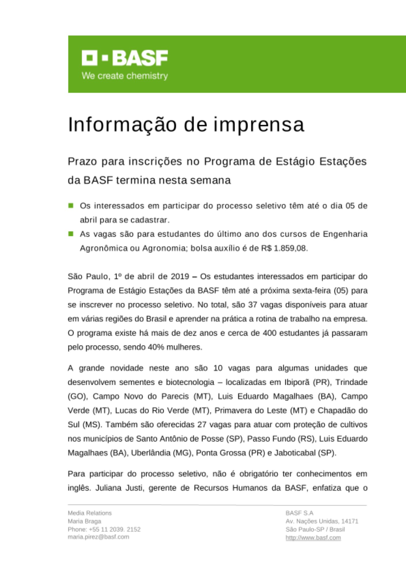 Os estudantes interessados em participar do Programa de Estágio Estações da BASF têm até a próxima sexta-feira (05) para se inscrever no processo seletivo. No total, são 37 vagas disponíveis para atuar em várias regiões do Brasil e aprender na prática a rotina de trabalho na empresa. O programa existe há mais de dez anos e cerca de 400 estudantes já passaram pelo processo, sendo 40% mulheres.