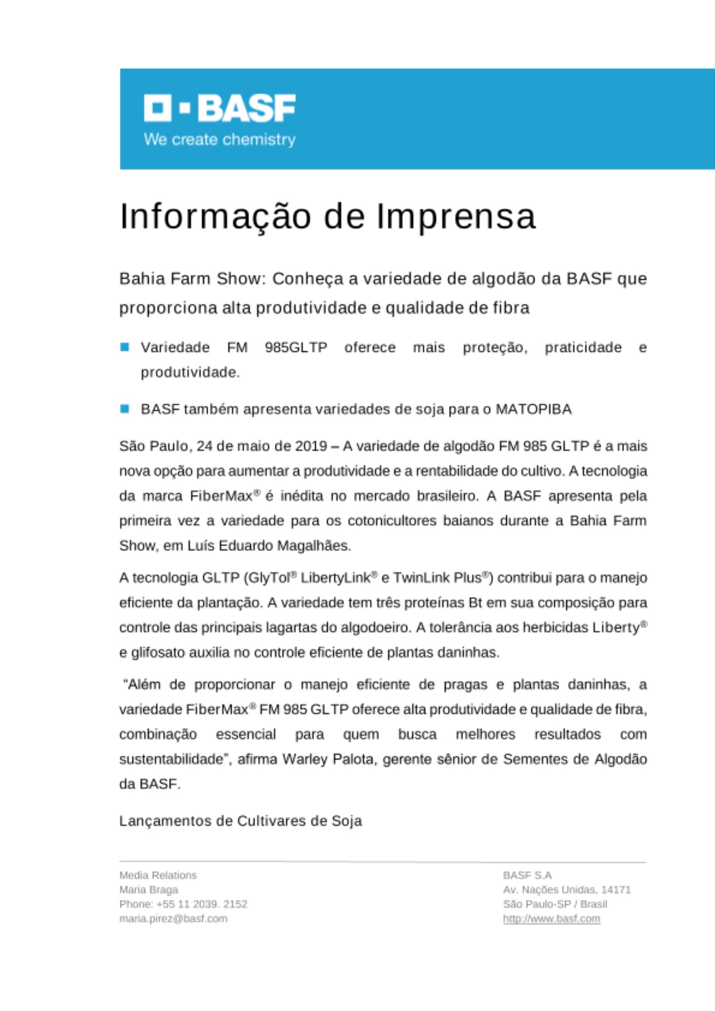 A variedade de algodão FM 985 GLTP é a mais nova opção para aumentar a produtividade e a rentabilidade do cultivo. A tecnologia da marca FiberMax® é inédita no mercado brasileiro. A BASF apresenta pela primeira vez a variedade para os cotonicultores baianos durante a Bahia Farm Show, em Luís Eduardo Magalhães.